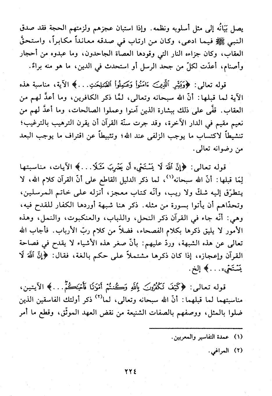 قوله تعالى: {إِنَّ اللَّهَ لا يَسْتَحْيِي أَنْ يَضْرِبَ مَثَلًا ...} الآيات، مناسبتها لما قبلها: أنّ الله سبحانه (¬1)، لما ذكر الدليل القاطع على أنّ القرآن كلام الله، لا يتطرّق إليه شكّ ولا ريب، وأنّه كتاب معجز، أنزله على خاتم المرسلين، وتحدّاهم أن يأتوا بسورة من مثله. ذكر هنا شبهة أوردها الكفار للقدح فيه، وهي: أنّه جاء في القرآن ذكر النحل، والذباب، والعنكبوت، والنمل، وهذه الأمور لا