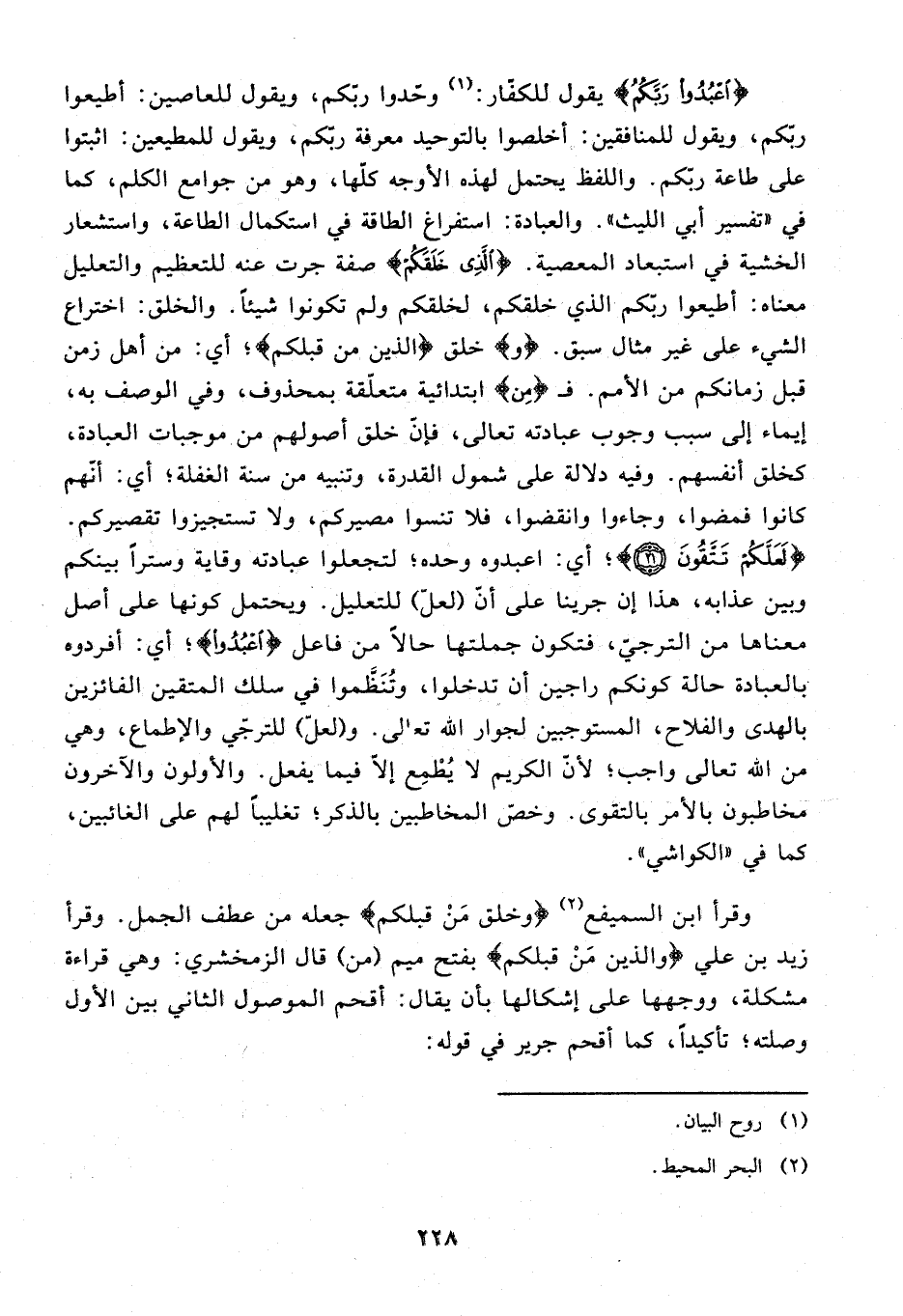 {اعْبُدُوا رَبَّكُمُ} يقول للكفّار: (¬1) وحّدوا ربّكم، ويقول للعاصين: أطيعوا ربّكم، ويقول للمنافقين: أخلصوا بالتوحيد معرفة ربّكم، ويقول للمطيعين: اثبتوا على طاعة ربّكم. واللفظ يحتمل لهذه الأوجه كلّها، وهو من جوامع الكلم، كما في «تفسير أبي الليث». والعبادة: استفراغ الطاقة في استكمال الطاعة، واستشعار الخشية في استبعاد المعصية. {الَّذِي خَلَقَكُمْ} صفة جرت عنه للتعظيم والتعليل معناه: أطيعوا ربّكم الذي خلقكم، لخلقكم ولم تكونوا شيئا. والخلق: اختراع الشيء على غير مثال سبق. {وَ} خلق {الَّذِينَ مِنْ قَبْلِكُمْ}؛ أي: من أهل زمن قبل زمانكم من الأمم. فـ {مِنْ} ابتدائية متعلّقة بمحذوف، وفي الوصف به، إيماء إلى سبب وجوب عبادته تعالى، فإنّ خلق أصولهم من موجبات العبادة، كخلق أنفسهم. وفيه دلالة على شمول القدرة، وتنبيه من سنة الغفلة؛ أي: أنّهم كانوا فمضوا، وجاءوا وانقضوا، فلا تنسوا مصيركم، ولا تستجيزوا تقصيركم.
