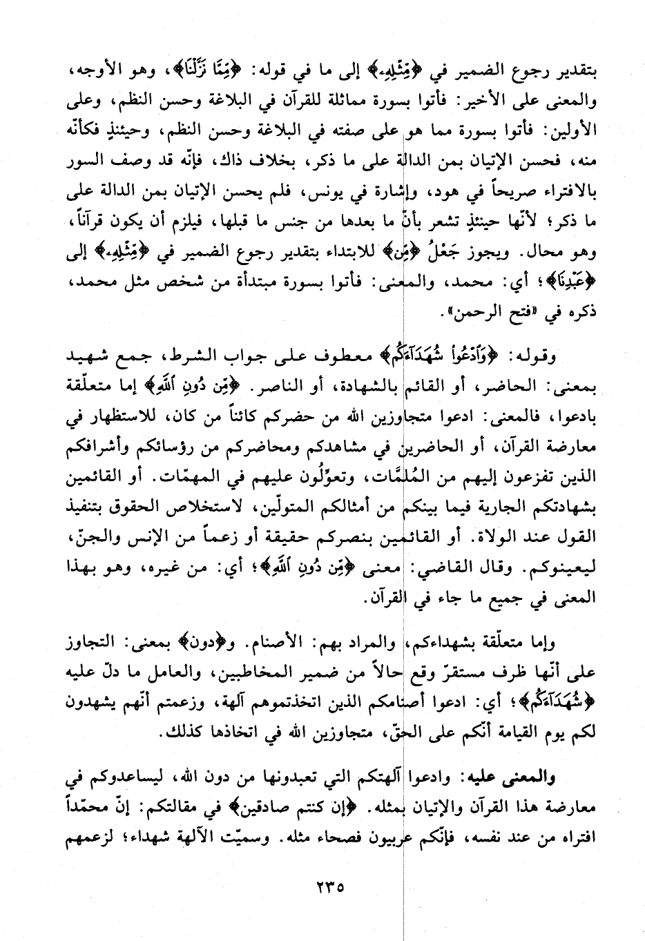 بتقدير رجوع الضمير في {مِثْلِهِ} إلى ما في قوله: {مِمَّا نَزَّلْنا}، وهو الأوجه، والمعنى على الأخير: فأتوا بسورة مماثلة للقرآن في البلاغة وحسن النظم، وعلى الأولين: فأتوا بسورة مما هو على صفته في البلاغة وحسن النظم، وحينئذ فكأنّه منه، فحسن الإتيان بمن الدالة على ما ذكر، بخلاف ذاك، فإنّه قد وصف السور بالافتراء صريحا في هود، وإشارة في يونس، فلم يحسن الإتيان بمن الدالة على ما ذكر؛ لأنّها حينئذ تشعر بأنّ ما بعدها من جنس ما قبلها، فيلزم أن يكون قرآنا، وهو محال. ويجوز جعل {مِنْ} للابتداء بتقدير رجوع الضمير في {مِثْلِهِ} إلى {عَبْدِنا}؛ أي: محمد، والمعنى: فأتوا بسورة مبتدأة من شخص مثل محمد، ذكره في «فتح الرحمن».