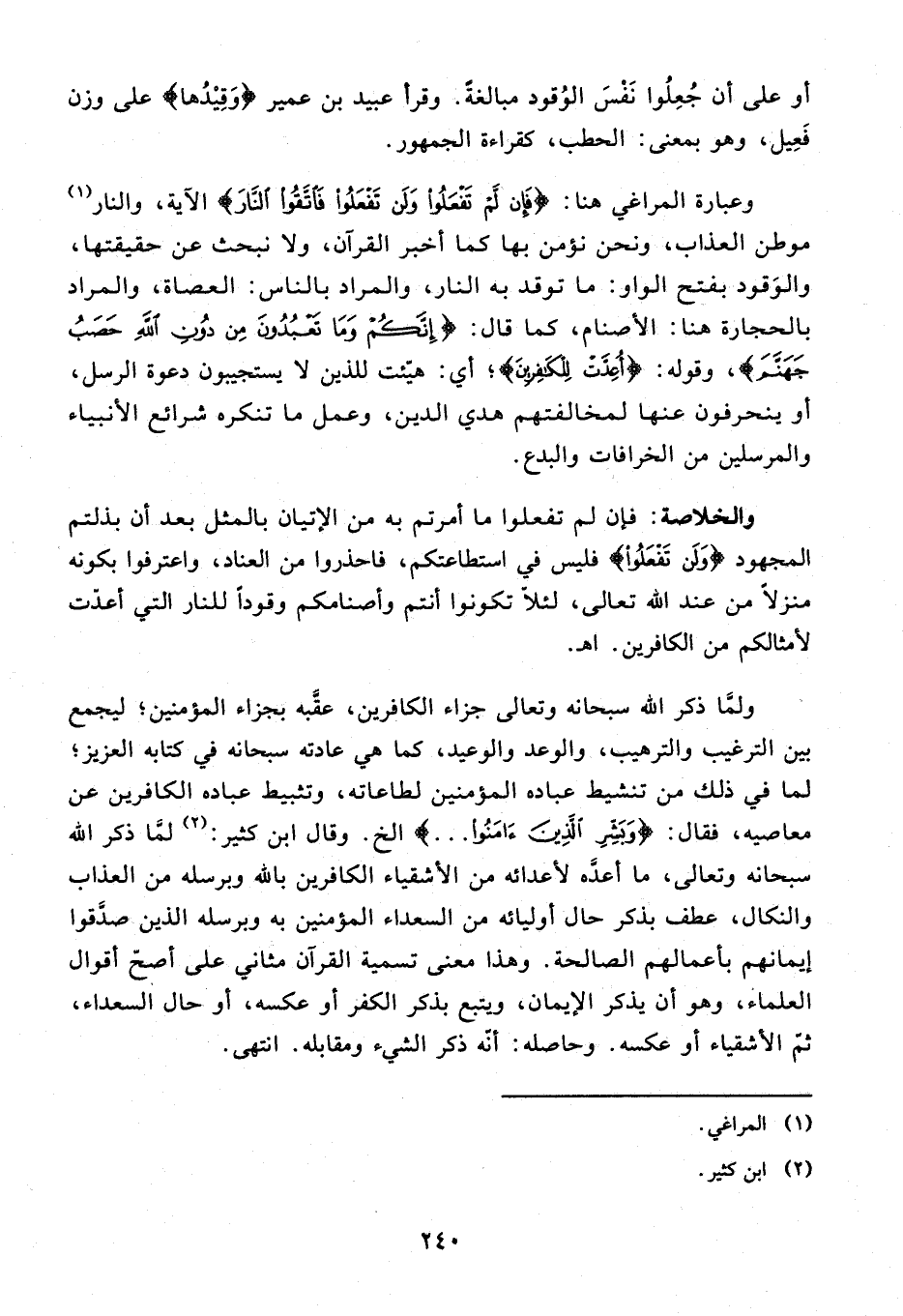وعبارة المراغي هنا: {فَإِنْ لَمْ تَفْعَلُوا وَلَنْ تَفْعَلُوا فَاتَّقُوا النَّارَ} الآية، والنار (¬1) موطن العذاب، ونحن نؤمن بها كما أخبر القرآن، ولا نبحث عن حقيقتها، والوقود بفتح الواو: ما توقد به النار، والمراد بالناس: العصاة، والمراد بالحجارة هنا: الأصنام، كما قال: {إِنَّكُمْ وَما تَعْبُدُونَ مِنْ دُونِ اللَّهِ حَصَبُ جَهَنَّمَ}، وقوله: {أُعِدَّتْ لِلْكافِرِينَ}؛ أي: هيّئت للذين لا يستجيبون دعوة الرسل، أو ينحرفون عنها لمخالفتهم هدي الدين، وعمل ما تنكره شرائع الأنبياء والمرسلين من الخرافات والبدع.