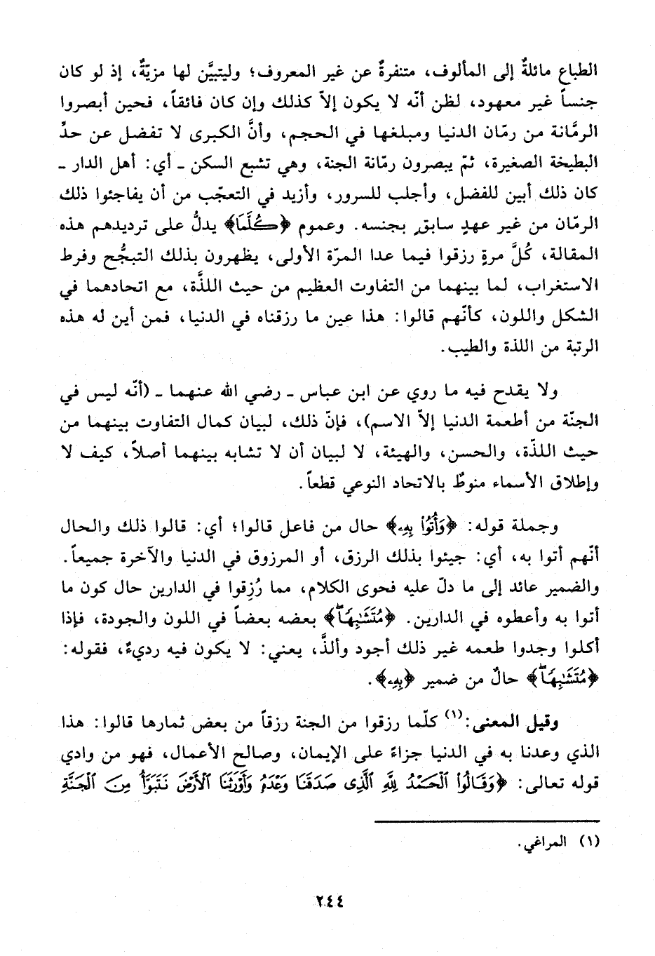 ولا يقدح فيه ما روي عن ابن عباس - رضي الله عنهما - (أنّه ليس في الجنّة من أطعمة الدنيا إلّا الاسم)، فإنّ ذلك، لبيان كمال التفاوت بينهما من حيث اللذّة، والحسن، والهيئة، لا لبيان أن لا تشابه بينهما أصلا، كيف لا وإطلاق الأسماء منوط بالاتحاد النوعي قطعا.