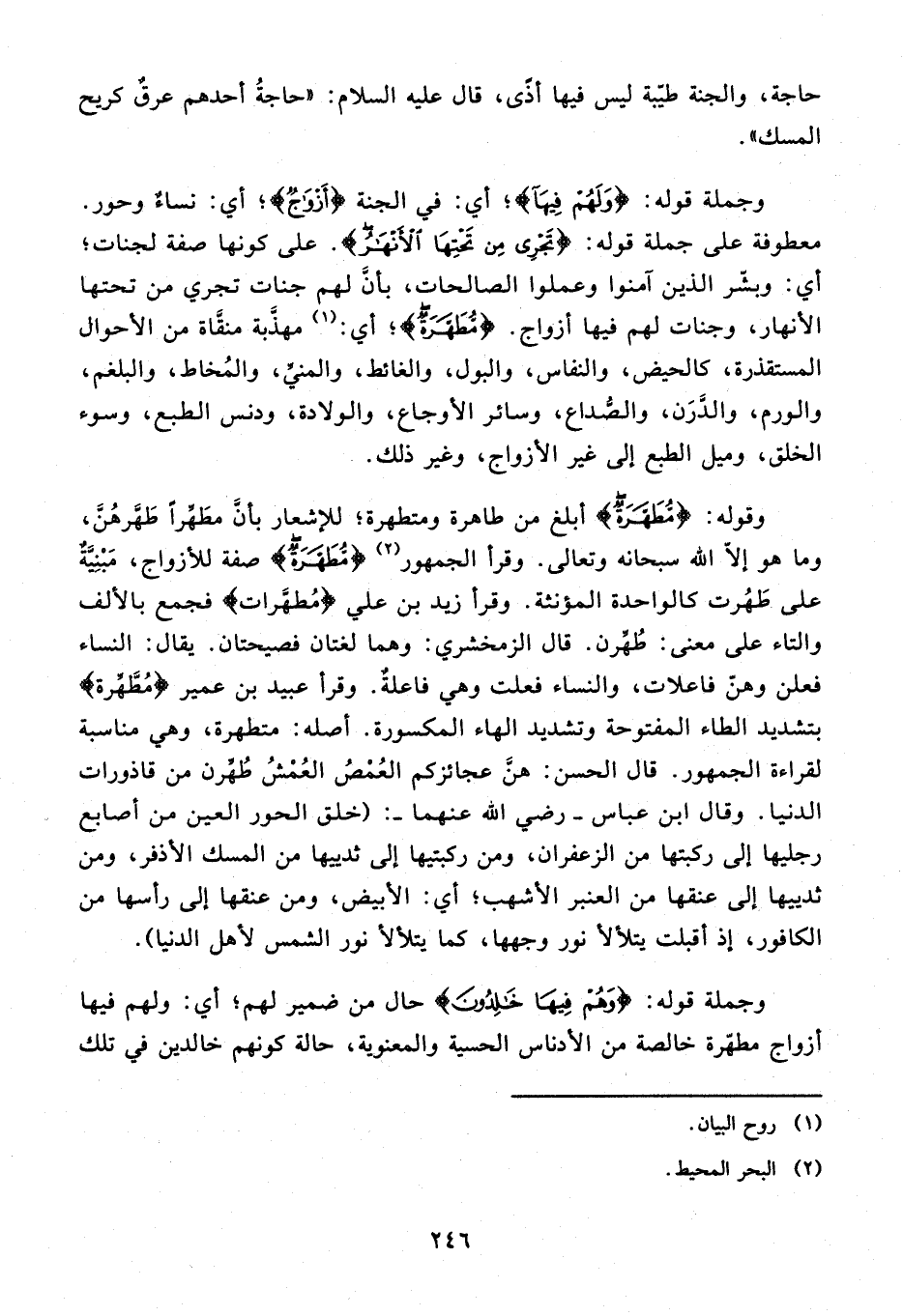 معطوفة على جملة قوله: {تَجْرِي مِنْ تَحْتِهَا الْأَنْهارُ}. على كونها صفة لجنات؛ أي: وبشّر الذين آمنوا وعملوا الصالحات، بأنّ لهم جنات تجري من تحتها الأنهار، وجنات لهم فيها أزواج. {مُطَهَّرَةٌ}؛ أي: (¬1) مهذّبة منقّاة من الأحوال المستقذرة، كالحيض، والنفاس، والبول، والغائط، والمنيّ، والمخاط، والبلغم، والورم، والدّرن، والصّداع، وسائر الأوجاع، والولادة، ودنس الطبع، وسوء الخلق، وميل الطبع إلى غير الأزواج، وغير ذلك.