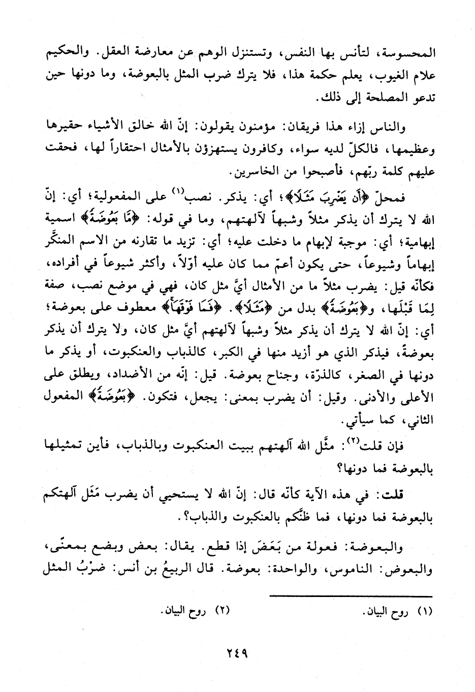 المحسوسة، لتأنس بها النفس، وتستنزل الوهم عن معارضة العقل. والحكيم علام الغيوب، يعلم حكمة هذا، فلا يترك ضرب المثل بالبعوضة، وما دونها حين تدعو المصلحة إلى ذلك.