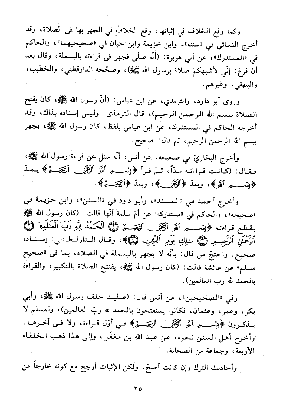 وكما وقع الخلاف في إثباتها، وقع الخلاف في الجهر بها في الصلاة، وقد أخرج النسائي في «سننه»، وابن خزيمة وابن حبان في «صحيحيهما»، والحاكم في «المستدرك»، عن أبي هريرة: (أنّه صلّى فجهر في قراءته بالبسملة، وقال بعد أن فرغ: إنّي لأشبهكم صلاة برسول الله صلّى الله عليه وسلّم)، وصحّحه الدارقطني، والخطيب، والبيهقي، وغيرهم.