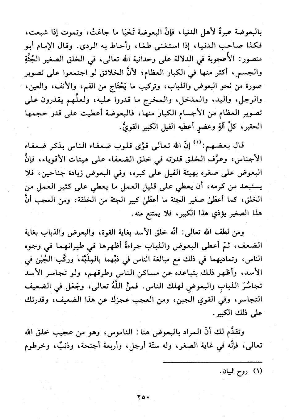 وتقدّم لك أنّ المراد بالبعوض هنا: الناموس، وهو من عجيب خلق الله تعالى، فإنّه في غاية الصغر، وله ستّة أرجل، وأربعة أجنحة، وذنب، وخرطوم
