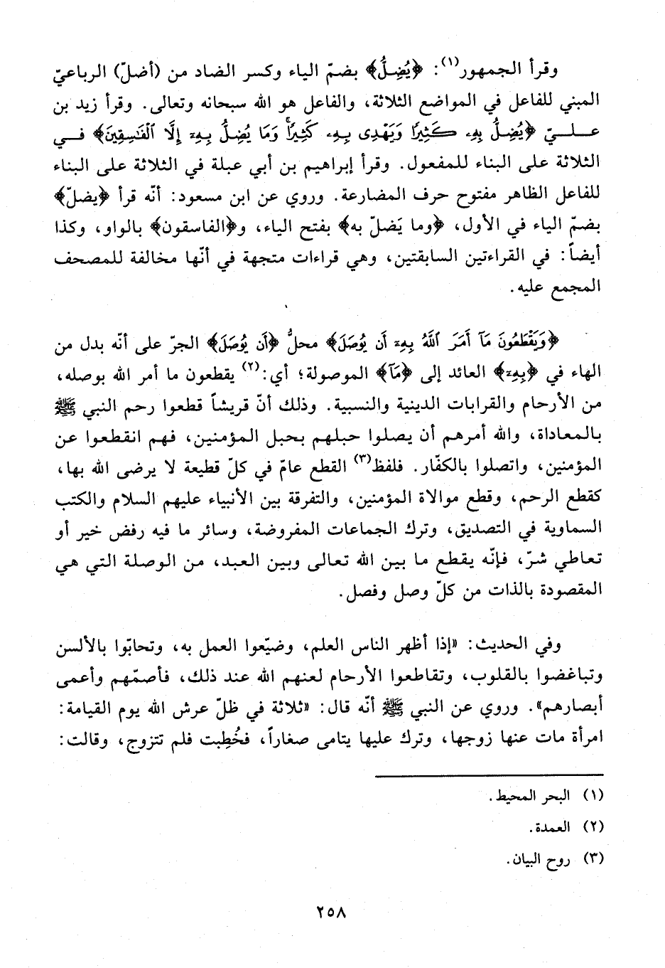 {وَيَقْطَعُونَ ما أَمَرَ اللَّهُ بِهِ أَنْ يُوصَلَ} محلّ {أَنْ يُوصَلَ} الجرّ على أنّه بدل من الهاء في {بِهِ} العائد إلى {ما} الموصولة؛ أي: (¬2) يقطعون ما أمر الله بوصله، من الأرحام والقرابات الدينية والنسبية. وذلك أنّ قريشا قطعوا رحم النبي صلّى الله عليه وسلّم بالمعاداة، والله أمرهم أن يصلوا حبلهم بحبل المؤمنين، فهم انقطعوا عن المؤمنين، واتصلوا بالكفّار. فلفظ (¬3) القطع عامّ في كلّ قطيعة لا يرضى الله بها، كقطع الرحم، وقطع موالاة المؤمنين، والتفرقة بين الأنبياء عليهم السلام والكتب السماوية في التصديق، وترك الجماعات المفروضة، وسائر ما فيه رفض خير أو تعاطي شرّ، فإنّه يقطع ما بين الله تعالى وبين العبد، من الوصلة التي هي المقصودة بالذات من كلّ وصل وفصل.
