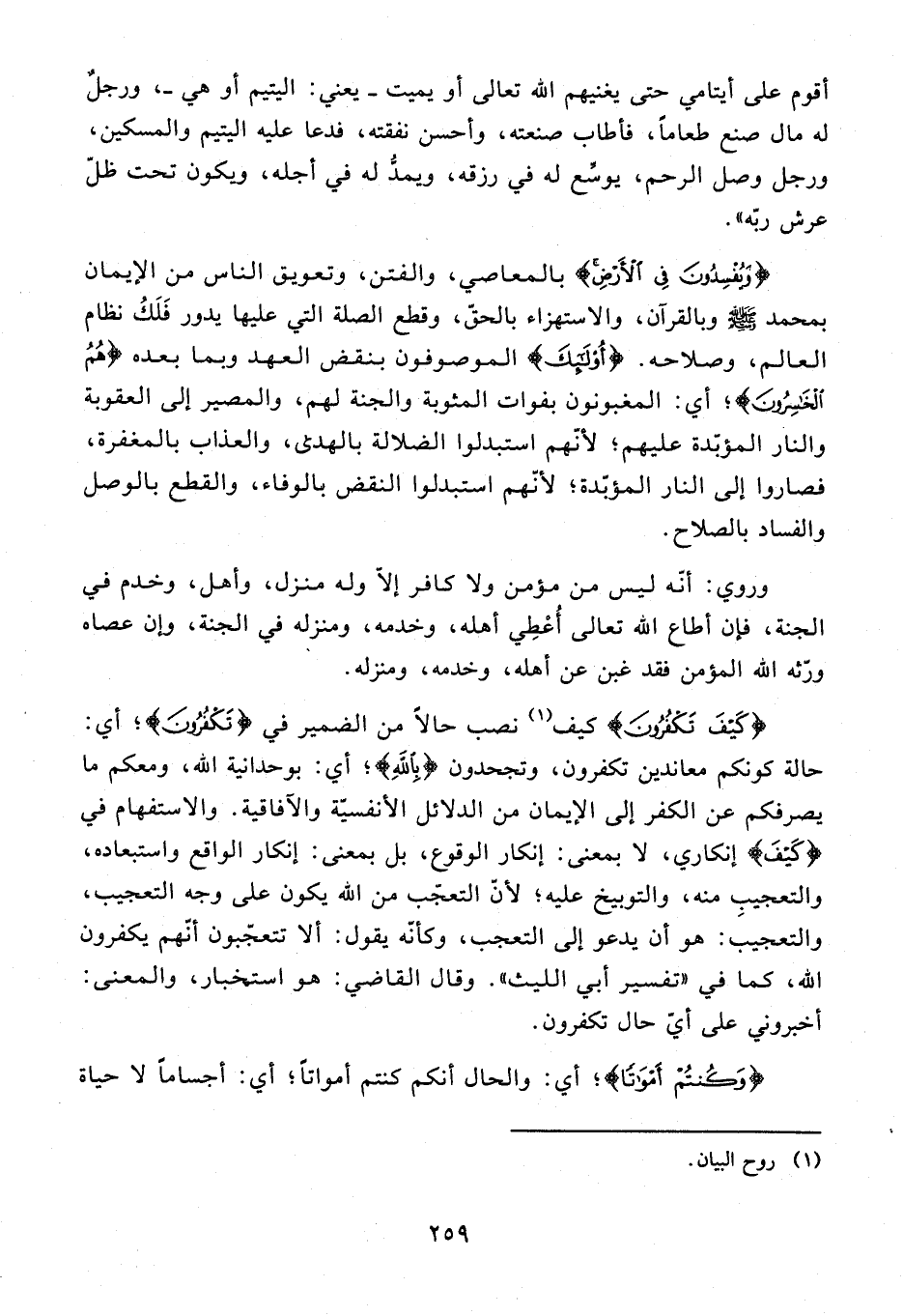 {وَيُفْسِدُونَ فِي الْأَرْضِ} بالمعاصي، والفتن، وتعويق الناس من الإيمان بمحمد صلّى الله عليه وسلّم وبالقرآن، والاستهزاء بالحقّ، وقطع الصلة التي عليها يدور فلك نظام العالم، وصلاحه. {أُولئِكَ} الموصوفون بنقض العهد وبما بعده {هُمُ الْخاسِرُونَ}؛ أي: المغبونون بفوات المثوبة والجنة لهم، والمصير إلى العقوبة والنار المؤبّدة عليهم؛ لأنّهم استبدلوا الضلالة بالهدى، والعذاب بالمغفرة، فصاروا إلى النار المؤبّدة؛ لأنّهم استبدلوا النقض بالوفاء، والقطع بالوصل والفساد بالصلاح.