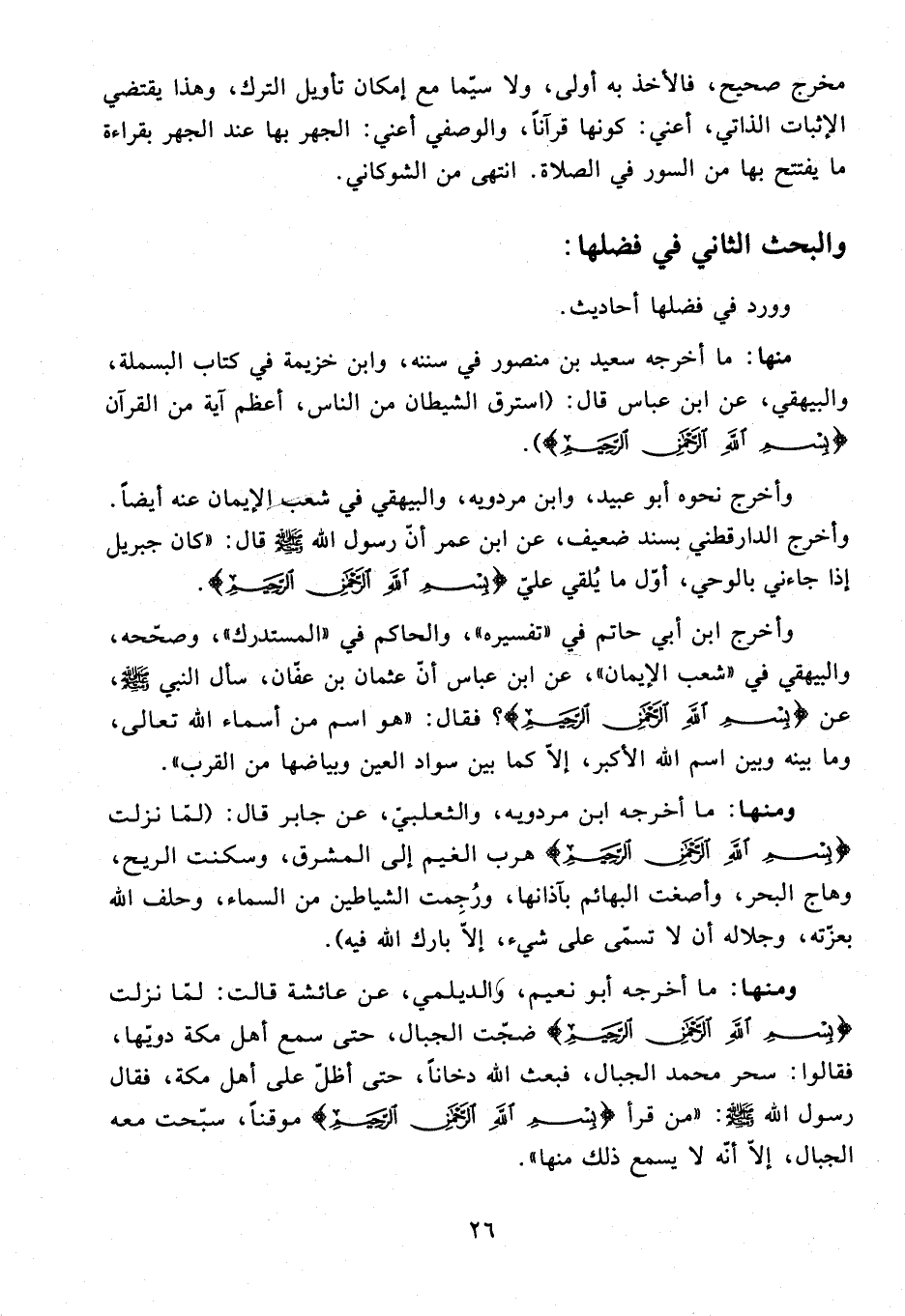 مخرج صحيح، فالأخذ به أولى، ولا سيّما مع إمكان تأويل الترك، وهذا يقتضي الإثبات الذاتي، أعني: كونها قرآنا، والوصفي أعني: الجهر بها عند الجهر بقراءة ما يفتتح بها من السور في الصلاة. انتهى من الشوكاني.