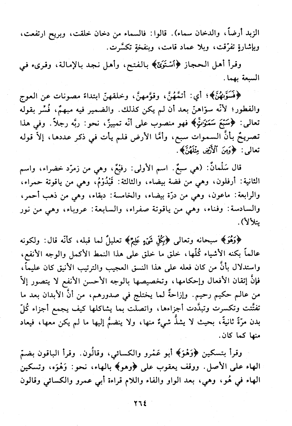{فَسَوَّاهُنَّ}؛ أي: أتمّهنّ، وقوّمهنّ، وخلقهنّ ابتداء مصونات عن العوج والفطور؛ لأنّه سوّاهنّ بعد أن لم يكن كذلك. والضمير فيه مبهم، فسّر بقوله تعالى: {سَبْعَ سَماواتٍ} فهو منصوب على أنّه تمييز، نحو: ربّه رجلا. وفي هذا تصريح بأنّ السموات سبع، وأمّا الأرض فلم يأت في ذكر عددها، إلّا قوله تعالى: {وَمِنَ الْأَرْضِ مِثْلَهُنَّ}.