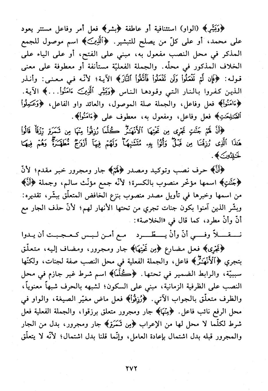 {وَبَشِّرِ} (الواو) استئنافية أو عاطفة {بَشِّرِ} فعل أمر وفاعل مستتر يعود على محمد، أو على كلّ من يصلح للتبشير. {الَّذِينَ} اسم موصول للجمع المذكر في محل النصب مفعول به، مبني على الفتح، أو على الياء على الخلاف المذكور في محلّه. والجملة الفعليّة مستأنفة أو معطوفة على معنى قوله: {فَإِنْ لَمْ تَفْعَلُوا وَلَنْ تَفْعَلُوا فَاتَّقُوا النَّارَ} الآية؛ لأنّه في معنى: وأنذر الذين كفروا بالنار التي وقودها الناس {وَبَشِّرِ الَّذِينَ آمَنُوا ...} الآية.