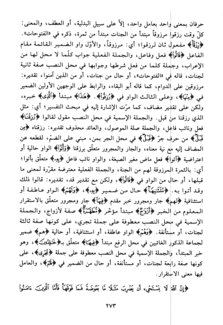 حرفان بمعنى واحد بعامل واحد، إلّا على سبيل البدلية، أو العطف، والمعنى: كلّ وقت رزقوا مرزوقا مبتدأ من الجنات مبتدأ من ثمرة، ذكره في «الفتوحات». {رِزْقًا} مفعول ثان لرزقوا؛ أي: مرزوقا، والأوّل واو الضمير القائمة مقام الفاعل {قالُوا} فعل وفاعل، والجملة الفعلية جواب كلّما لا محل لها من الإعراب، وجملة كلما من فعل شرطها وجوابها في محل النصب صفة ثانية لجنات، قاله في «الفتوحات»، أو حال من جنات، أو من الذين آمنوا، تقديره: مرزوقين على الدوام، كما قاله أبو البقاء، والرابط على الوجهين الأولين الضمير في {مِنْها}، وعلى الثالث الواو في {رُزِقُوا}. هذَا مبتدأ {الَّذِي} خبره، ولكن على تقدير مضاف، كما مرّت الإشارة إليه في مبحث التفسير؛ أي: مثل الذي رزقنا من قبل. والجملة الإسمية في محل النصب مقول لقالوا {رُزِقْنا} فعل ونائب فاعل، والجملة صلة الموصول، والعائد محذوف تقديره: رزقناه {مِنْ قَبْلُ} من حرف جرّ {قَبْلُ} في محل الجر بمن، مبني على الضمّ، لقطعه عن المضاف إليه مع نية معناه، والجار والمجرور متعلّق برزقنا {وَأُتُوا} الواو حالية أو اعتراضية أُتُوا فعل ماض مغير الصيغة، والواو نائب فاعل {بِهِ} متعلّق بأتوا؛ أي: بالثمرة المرزوقة لهم من الجنة، والجملة الفعلية معترضة مقرّرة لمعنى ما قبلها، أو حال من الواو في {قالُوا}، ولكن مع تقدير قد، تقديره: قالوا ذلك وقد أتوا به. {مُتَشابِهًا} حال من ضمير {بِهِ}، {وَلَهُمْ} الواو عاطفة أو استئنافية {لَهُمْ} جار ومجرور خبر مقدم {فِيها} جار ومجرور متعلّق بالاستقرار المعلوم من الخبر {أَزْواجٌ} مبتدأ مؤخّر {مُطَهَّرَةٌ} صفة لأزواج، والجملة الإسمية في محل النصب معطوفة على جملة تجري، على كونها صفة ثالثة لجنات، أو مستأنفة. {وَهُمْ} الواو عاطفة، أو استئنافية، أو حالية {هُمْ} ضمير لجماعة الذكور الغائبين في محل الرفع مبتدأ {فِيها} متعلّق بـ {خالِدُونَ}، وهو خبر المبتدأ، والجملة الإسمية في محل النصب معطوفة على جملة {تَجْرِي}، على كونها صفة رابعة لجنات، أو مستأنفة، أو حال من الضمير في {لَهُمْ}، والعامل فيها معنى الاستقرار.