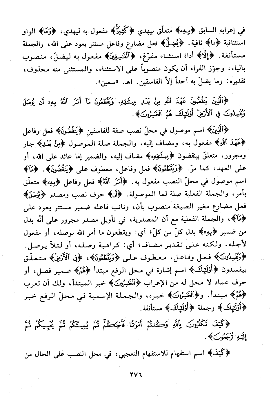 في إعرابه السابق {بِهِ} متعلّق بيهدي {كَثِيرًا} مفعول به ليهدي، {وَما} الواو استئنافية {ما} نافية. {يُضِلُّ} فعل مضارع وفاعل مستتر يعود على الله، والجملة مستأنفة. {إِلَّا} أداة استثناء مفرّغ، {الْفاسِقِينَ} مفعول به ليضلّ، منصوب بالياء، وجوّز الفراء أن يكون منصوبا على الاستثناء، والمستثنى منه محذوف، تقديره: وما يضلّ به أحدا إلّا الفاسقين. اه. «سمين».