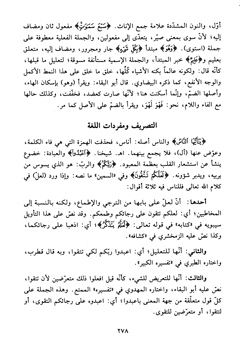 والثاني: أنّها للتعليل؛ أي: اعبدوا ربّكم لكي تتقوا، وبه قال قطرب، واختاره الطبري في «تفسيره الكبير».