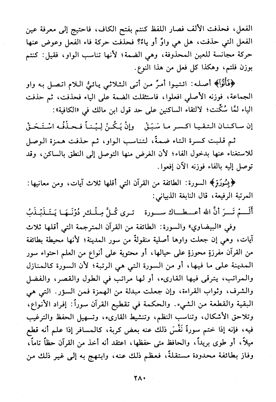 وفي «البيضاوي» والسورة: الطائفة من القرآن المترجمة التي أقلها ثلاث آيات، وهي إن جعلت واوها أصلية منقولة من سور المدينة؛ لأنها محيطة بطائفة من القرآن مفرزة محوزة على حيالها، أو محتوية على أنواع من العلم احتواء سور المدينة على ما فيها، أو من السورة التي هي الرتبة؛ لأن السورة كالمنازل والمراتب، يترقى فيها القارىء، أو لها مراتب في الطول والقصر، والفضل والشرف، وثواب القراءة، وإن جعلت مبدلة من الهمزة فمن السؤر. التي هي البقية والقطعة من الشيء. والحكمة في تقطيع القرآن سورا: إفراد الأنواع، وتلاحق الأشكال، وتناسب النظم، وتنشيط القارىء، وتسهيل الحفظ والترغيب فيه، فإنه إذا ختم سورة نفّس ذلك عنه بعض كربة، كالمسافر إذا علم أنه قطع ميلا، أو طوى بريدا، والحافظ متى حفظها، اعتقد أنه أخذ من القرآن حظا تاما، وفاز بطائفة محدودة مستقلة، فعظم ذلك عنه، وابتهج به إلى غير ذلك من