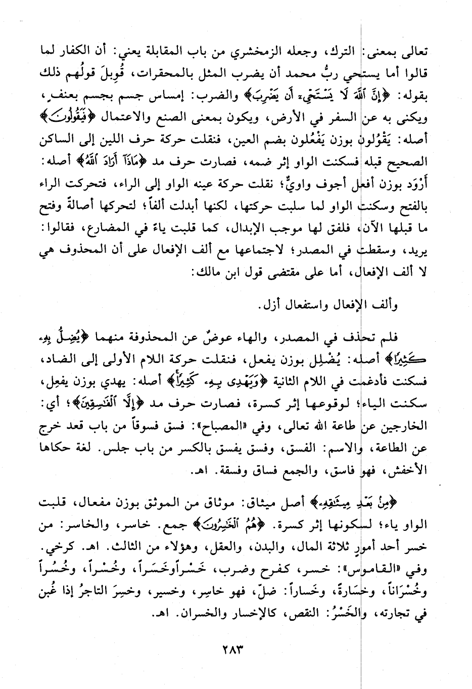 فلم تحذف في المصدر، والهاء عوض عن المحذوفة منهما {يُضِلُّ بِهِ كَثِيرًا} أصله: يضلل بوزن يفعل، فنقلت حركة اللام الأولى إلى الضاد، فسكنت فأدغمت في اللام الثانية {وَيَهْدِي بِهِ كَثِيرًا} أصله: يهدي بوزن يفعل، سكنت الياء؛ لوقوعها إثر كسرة، فصارت حرف مد {إِلَّا الْفاسِقِينَ}؛ أي:
