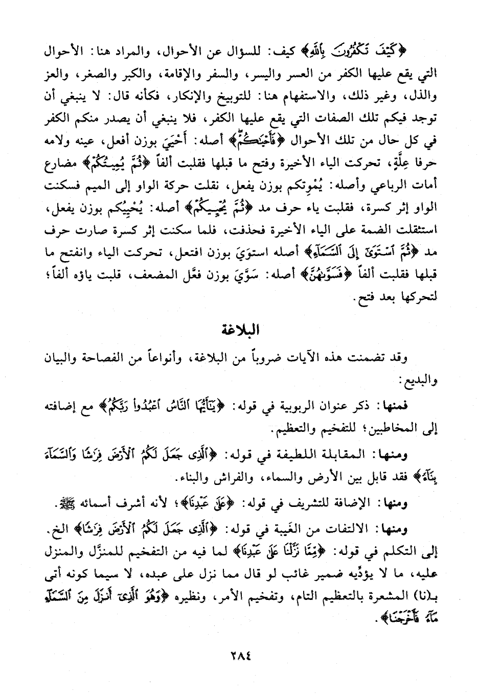 {كَيْفَ تَكْفُرُونَ بِاللَّهِ} كيف: للسؤال عن الأحوال، والمراد هنا: الأحوال التي يقع عليها الكفر من العسر واليسر، والسفر والإقامة، والكبر والصغر، والعز والذل، وغير ذلك، والاستفهام هنا: للتوبيخ والإنكار، فكأنه قال: لا ينبغي أن توجد فيكم تلك الصفات التي يقع عليها الكفر، فلا ينبغي أن يصدر منكم الكفر في كل حال من تلك الأحوال {فَأَحْياكُمْ} أصله: أحيي بوزن أفعل، عينه ولامه حرفا علّة، تحركت الياء الأخيرة وفتح ما قبلها فقلبت ألفا {ثُمَّ يُمِيتُكُمْ} مضارع أمات الرباعي وأصله: يموتكم بوزن يفعل، نقلت حركة الواو إلى الميم فسكنت الواو إثر كسرة، فقلبت ياء حرف مد {ثُمَّ يُحْيِيكُمْ} أصله: يحييكم بوزن يفعل، استثقلت الضمة على الياء الأخيرة فحذفت، فلما سكنت إثر كسرة صارت حرف مد {ثُمَّ اسْتَوى إِلَى السَّماءِ} أصله استوي بوزن افتعل، تحركت الياء وانفتح ما قبلها فقلبت ألفا {فَسَوَّاهُنَّ} أصله: سوّي بوزن فعّل المضعف، قلبت ياؤه ألفا؛ لتحركها بعد فتح.