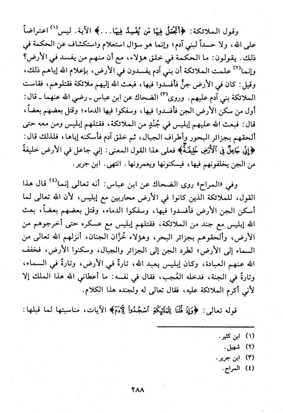 وفي «المراح» روى الضحاك عن ابن عباس: أنه تعالى إنما (¬4) قال هذا القول، للملائكة الذين كانوا في الأرض محاربين مع إبليس، لأن الله تعالى لما أسكن الجن الأرض فأفسدوا فيها، وسفكوا الدماء، وقتل بعضهم بعضا، بعث الله إبليس مع جند من الملائكة، فقتلهم إبليس مع عسكره حتى أخرجوهم من الأرض، وألحقوهم بجزائر البحر، وهؤلاء خزّان الجنان، أنزلهم الله تعالى من السماء إلى الأرض؛ لطرد الجن إلى الجزائر والجبال، وسكنوا الأرض، فخفف الله عنهم العبادة، وكان إبليس يعبد الله، تارة في الأرض، وتارة في السماء، وتارة في الجنة، فدخله العجب، فقال في نفسه: ما أعطاني الله هذا الملك إلا لأني أكرم الملائكة عليه، فقال تعالى له ولجنده هذا الكلام.