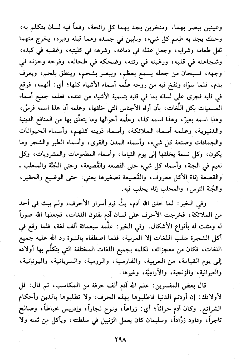وعينين يبصر بهما، ومنخرين يجد بهما كل رائحة، وفما فيه لسان يتكلم به، وحنك يجد به طعم كل شيء، وبابين في جسده وهما قبله ودبره، يخرج منهما ثفل طعامه وشرابه، وجعل عقله في دماغه، وشرهه في كليتيه، وغضبه في كبده، وشجاعته في قلبه، ورغبته في رئته، وضحكه في طحاله، وفرحه وحزنه في وجهه، فسبحان من جعله يسمع بعظم، ويبصر بشحم، وينطق بلحم، ويعرف بدم، فلما سوّاه ونفخ فيه من روحه علّمه أسماء الأشياء كلها؛ أي: ألهمه، فوقع في قلبه فجرى على لسانه بما في قلبه