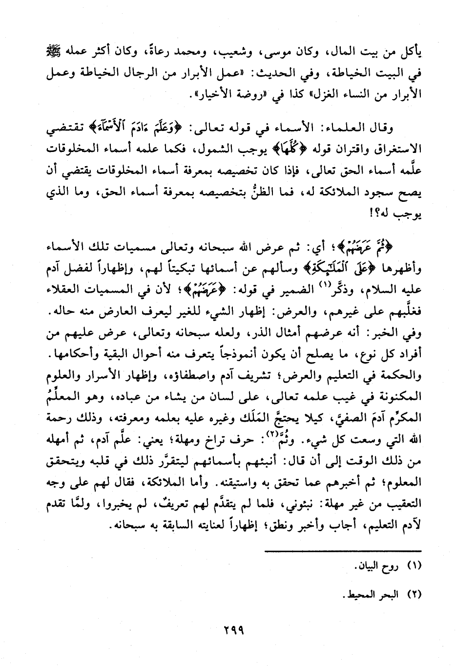 31 - وقال العلماء: الأسماء في قوله تعالى: {وَعَلَّمَ آدَمَ الْأَسْماءَ} تقتضي الاستغراق واقتران قوله {كُلَّها} يوجب الشمول، فكما علمه أسماء المخلوقات علّمه أسماء الحق تعالى، فإذا كان تخصيصه بمعرفة أسماء المخلوقات يقتضي أن يصح سجود الملائكة له، فما الظنّ بتخصيصه بمعرفة أسماء الحق، وما الذي يوجب له؟!