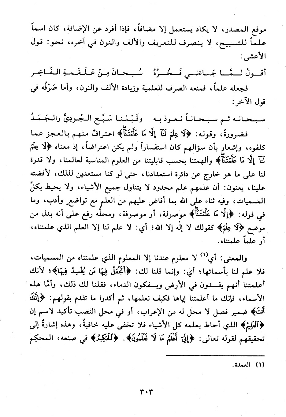 فضرورة، وقوله: {لا عِلْمَ لَنا إِلَّا ما عَلَّمْتَنا} اعتراف منهم بالعجز عما كلفوه، وإشعار بأن سؤالهم كان استفسارا ولم يكن اعتراضا، إذ معناه {لا عِلْمَ لَنا إِلَّا ما عَلَّمْتَنا} وألهمتنا بحسب قابليتنا من العلوم المناسبة لعالمنا، ولا قدرة لنا على ما هو خارج عن دائرة استعدادنا، حتى لو كنا مستعدين لذلك، لأفضته علينا، يعنون: أن علمهم علم محدود لا يتناول جميع الأشياء، ولا يحيط بكلّ المسميات، وفيه ثناء على الله بما أفاض عليهم من العلم مع تواضع وأدب، وما في قوله: {إِلَّا ما عَلَّمْتَنا} موصولة، أو موصوفة، ومحلّه رفع على أنه بدل من موضع {لا عِلْمَ} كقولك لا إله إلا الله؛ أي: لا علم لنا إلا العلم الذي علمتناه، أو علما علمتناه.