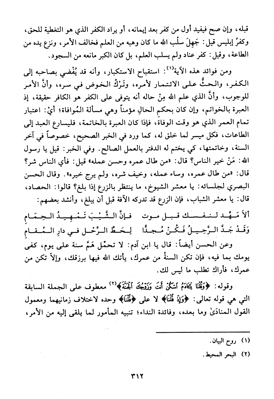 35 - وقوله: {وَقُلْنا يا آدَمُ اسْكُنْ أَنْتَ وَزَوْجُكَ الْجَنَّةَ} (¬2) معطوف على الجملة السابقة التي هي قوله تعالى: {وَإِذْ قُلْنا} لا على {قُلْنا} وحده لاختلاف زمانيهما ومعمول القول المنادى وما بعده، وفائدة النداء؛ تنبيه المأمور لما يلقى إليه من الأمر،