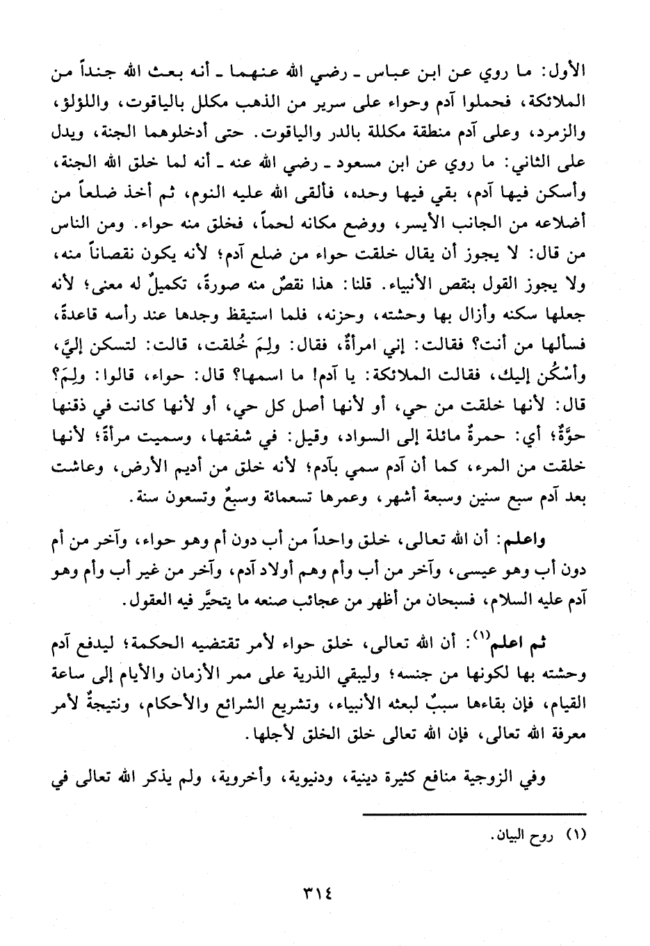 واعلم: أن الله تعالى، خلق واحدا من أب دون أم وهو حواء، وآخر من أم دون أب وهو عيسى، وآخر من أب وأم وهم أولاد آدم، وآخر من غير أب وأم وهو آدم عليه السلام، فسبحان من أظهر من عجائب صنعه ما يتحيّر فيه العقول.