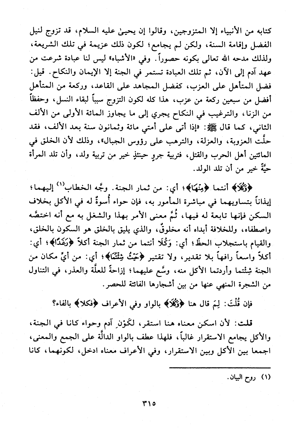كتابه من الأنبياء إلا المتزوجين، وقالوا إن يحيى عليه السلام، قد تزوج لنيل الفضل وإقامة السنة، ولكن لم يجامع؛ لكون ذلك عزيمة في تلك الشريعة، ولذلك مدحه الله تعالى بكونه حصورا. وفي «الأشباه» ليس لنا عبادة شرعت من عهد آدم إلى الآن، ثم تلك العبادة تستمر في الجنة إلا الإيمان والنكاح. قيل: فضل المتأهل على العزب، كفضل المجاهد على القاعد، وركعة من المتأهل أفضل من سبعين ركعة من عزب، هذا كله لكون التزوج سببا لبقاء النسل، وحفظا من الزنا، والترغيب في النكاح يجري إلى ما يجاوز المائة الأولى من الألف الثاني، كما قال صلّى الله عليه وسلّم: «إذا أتى على أمتي مائة وثمانون سنة بعد الألف، فقد حلّت العزوبة، والعزلة، والترهب على رؤوس الجبال»، وذلك لأن الخلق في المائتين أهل الحرب والقتل، فتربية جرو حينئذ خير من تربية ولد، وأن تلد المرأة حيّة خير من أن تلد الولد.