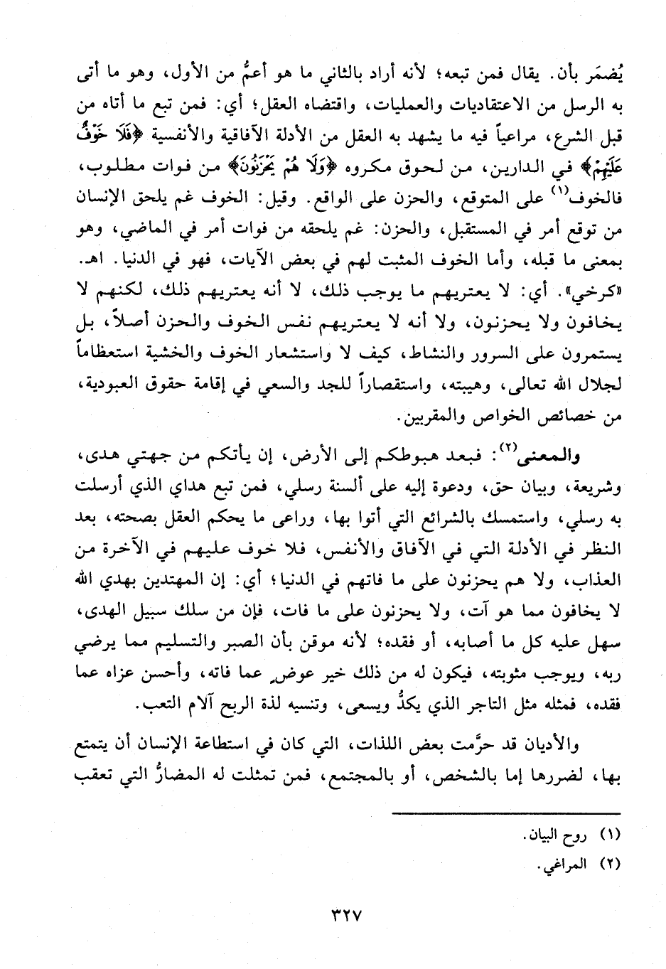 يضمر بأن. يقال فمن تبعه؛ لأنه أراد بالثاني ما هو أعمّ من الأول، وهو ما أتى به الرسل من الاعتقاديات والعمليات، واقتضاه العقل، أي: فمن تبع ما أتاه من قبل الشرع، مراعيا فيه ما يشهد به العقل من الأدلة الآفاقية والأنفسية {فَلا خَوْفٌ عَلَيْهِمْ} في الدارين، من لحوق مكروه {وَلا هُمْ يَحْزَنُونَ} من فوات مطلوب، فالخوف (¬1) على المتوقع، والحزن على الواقع. وقيل: الخوف غم يلحق الإنسان من توقع أمر في المستقبل، والحزن: غم يلحقه من فوات أمر في الماضي، وهو بمعنى ما قبله، وأما الخوف المثبت لهم في بعض الآيات، فهو في الدنيا. اه.