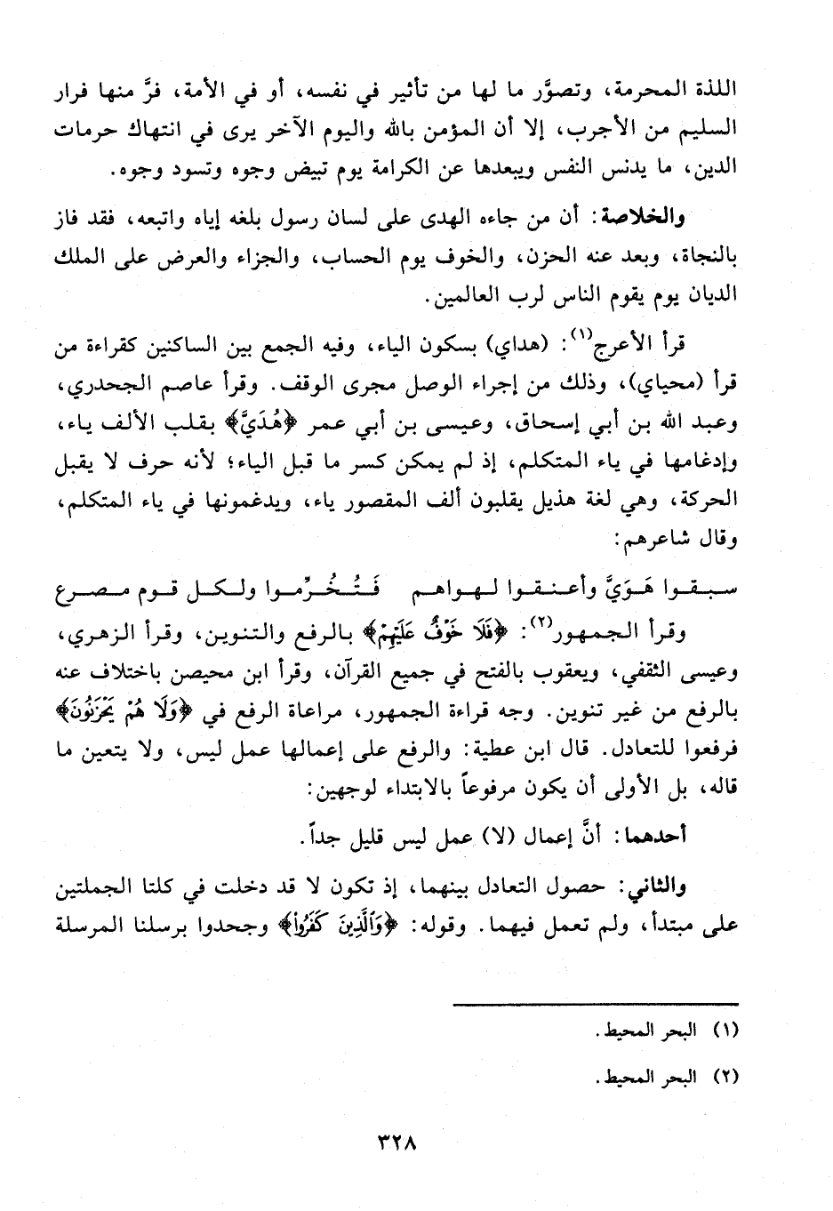 وقرأ الجمهور (¬2): {فَلا خَوْفٌ عَلَيْهِمْ} بالرفع والتنوين، وقرأ الزهري، وعيسى الثقفي، ويعقوب بالفتح في جميع القرآن، وقرأ ابن محيصن باختلاف عنه بالرفع من غير تنوين. وجه قراءة الجمهور، مراعاة الرفع في {وَلا هُمْ يَحْزَنُونَ} فرفعوا للتعادل. قال ابن عطية: والرفع على إعمالها عمل ليس، ولا يتعين ما قاله، بل الأولى أن يكون مرفوعا بالابتداء لوجهين: