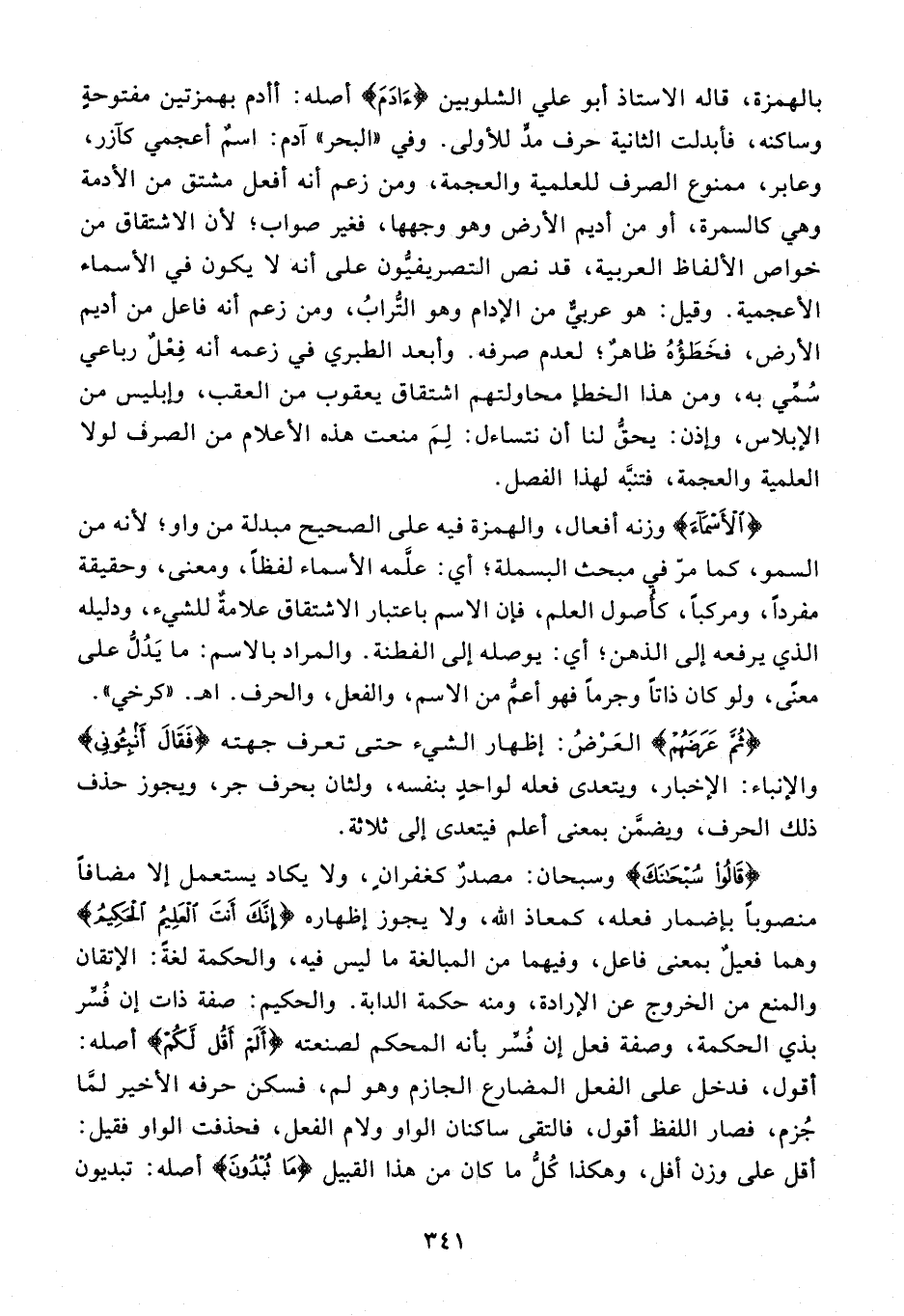 بالهمزة، قاله الاستاذ أبو علي الشلوبين {آدَمَ} أصله: أأدم بهمزتين مفتوحة وساكنه، فأبدلت الثانية حرف مدّ للأولى. وفي «البحر» آدم: اسم أعجمي كآزر، وعابر، ممنوع الصرف للعلمية والعجمة، ومن زعم أنه أفعل مشتق من الأدمة وهي كالسمرة، أو من أديم الأرض وهو وجهها، فغير صواب؛ لأن الاشتقاق من خواص الألفاظ العربية، قد نص التصريفيّون على أنه لا يكون في الأسماء الأعجمية. وقيل: هو عربيّ من الإدام وهو التّراب، ومن زعم أنه فاعل من أديم الأرض، فخطؤه ظاهر؛ لعدم صرفه. وأبعد الطبري في زعمه أنه فعل رباعي سمّي به، ومن هذا الخطإ محاولتهم اشتقاق يعقوب من العقب، وإبليس من الإبلاس، وإذن: يحقّ لنا أن نتساءل: لم منعت هذه الأعلام من الصرف لولا العلمية والعجمة، فتنبّه لهذا الفصل.