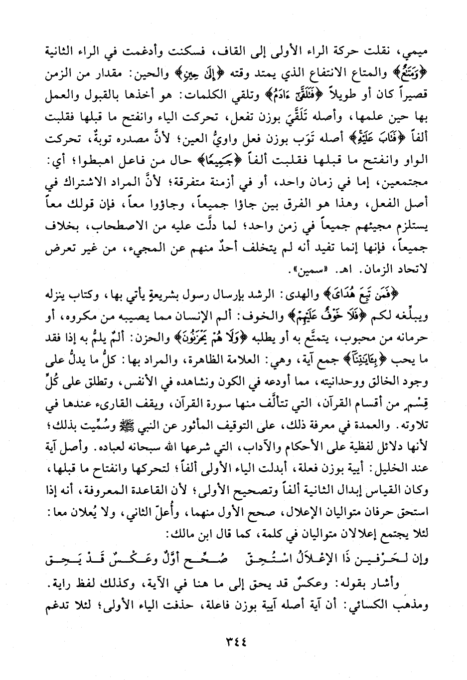 ميمي، نقلت حركة الراء الأولى إلى القاف، فسكنت وأدغمت في الراء الثانية {وَمَتاعٌ} والمتاع الانتفاع الذي يمتد وقته {إِلى حِينٍ} والحين: مقدار من الزمن قصيرا كان أو طويلا {فَتَلَقَّى آدَمُ} وتلقي الكلمات: هو أخذها بالقبول والعمل بها حين علمها، وأصله تلقّي بوزن تفعل، تحركت الياء وانفتح ما قبلها فقلبت ألفا {فَتابَ عَلَيْهِ} أصله توب بوزن فعل واويّ العين؛ لأنّ مصدره توبة، تحركت الواو وانفتح ما قبلها فقلبت ألفا {جَمِيعًا} حال من فاعل اهبطوا؛ أي: مجتمعين، إما في زمان واحد، أو في أزمنة متفرقة؛ لأنّ المراد الاشتراك في أصل الفعل، وهذا هو الفرق بين جاؤا جميعا، وجاؤوا معا، فإن قولك معا يستلزم مجيئهم جميعا في زمن واحد؛ لما دلّت عليه من الاصطحاب، بخلاف جميعا، فإنها إنما تفيد أنه لم يتخلف أحد منهم عن المجيء، من غير تعرض لاتحاد الزمان. اه. «سمين».