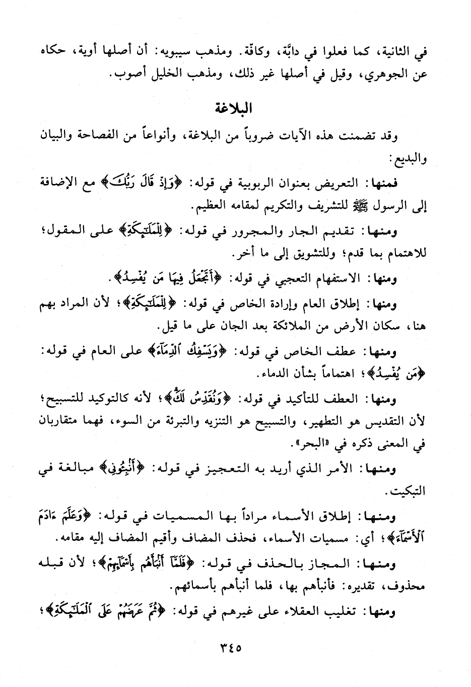 ومنها: إطلاق الأسماء مرادا بها المسميات في قوله: {وَعَلَّمَ آدَمَ الْأَسْماءَ}؛ أي: مسميات الأسماء، فحذف المضاف وأقيم المضاف إليه مقامه.
