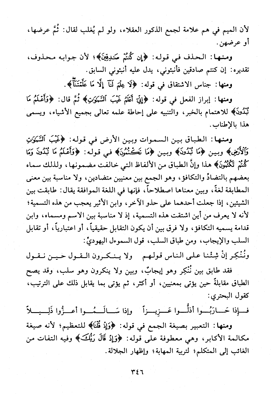 ومنها: الطباق بين السموات وبين الأرض في قوله: {غَيْبَ السَّماواتِ وَالْأَرْضِ} وبين {ما تُبْدُونَ} وبين {ما كُنْتُمْ تَكْتُمُونَ} في قوله: {وَأَعْلَمُ ما تُبْدُونَ وَما كُنْتُمْ تَكْتُمُونَ} هذا وإنّ الطباق من الألفاظ التي خالفت مضمونها، ولذلك سماه بعضهم بالتضادّ والتكافؤ، وهو الجمع بين معنيين متضادين، ولا مناسبة بين معنى المطابقة لغة، وبين معناها اصطلاحا، فإنها في اللغة الموافقة يقال: طابقت بين الشيئين، إذا جعلت أحدهما على حذو الآخر، وابن الأثير يعجب من هذه التسمية؛ لأنه لا يعرف من أين اشتقت هذه التسمية، إذ لا مناسبة بين الاسم ومسماه، وابن قدامة يسميه التكافؤ، ولا فرق بين أن يكون التقابل حقيقيا، أو اعتباريا، أو تقابل السلب والإيجاب، ومن طباق السلب، قول السموءل اليهوديّ: