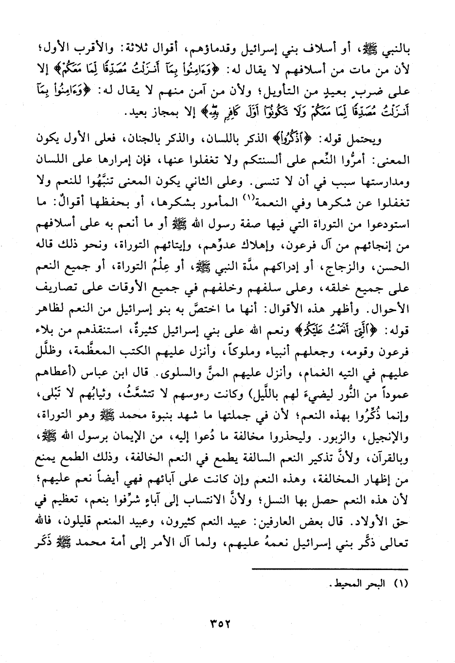 ويحتمل قوله: {اذْكُرُوا} الذكر باللسان، والذكر بالجنان، فعلى الأول يكون المعنى: أمرّوا النّعم على ألسنتكم ولا تغفلوا عنها، فإن إمرارها على اللسان ومدارستها سبب في أن لا تنسى. وعلى الثاني يكون المعنى تنبّهوا للنعم ولا تغفلوا عن شكرها وفي النعمة (¬1) المأمور بشكرها، أو بحفظها أقوال: ما استودعوا من التوراة التي فيها صفة رسول الله صلّى الله عليه وسلّم أو ما أنعم به على أسلافهم من إنجائهم من آل فرعون، وإهلاك عدوّهم، وإيتائهم التوراة، ونحو ذلك قاله الحسن، والزجاج، أو إدراكهم مدّة النبي صلّى الله عليه وسلّم، أو علم التوراة، أو جميع النعم على جميع خلقه، وعلى سلفهم وخلفهم في جميع الأوقات على تصاريف الأحوال. وأظهر هذه الأقوال: أنها ما اختصّ به بنو إسرائيل من النعم لظاهر قوله: {الَّتِي أَنْعَمْتُ عَلَيْكُمْ} ونعم الله على بني إسرائيل كثيرة، استنقذهم من بلاء فرعون وقومه، وجعلهم أنبياء وملوكا، وأنزل عليهم الكتب المعظّمة، وظلّل عليهم في التيه الغمام، وأنزل عليهم المنّ والسلوى. قال ابن عباس (أعطاهم عمودا من النّور ليضيء لهم باللّيل) وكانت رءوسهم لا تتشعّث، وثيابهم لا تبلى، وإنما ذكّروا بهذه النعم؛ لأن في جملتها ما شهد بنبوة محمد صلّى الله عليه وسلّم وهو التوراة، والإنجيل، والزبور. وليحذروا مخالفة ما دعوا إليه، من الإيمان برسول الله صلّى الله عليه وسلّم، وبالقرآن، ولأنّ تذكير النعم السالفة يطمع في النعم الخالفة، وذلك الطمع يمنع من إظهار المخالفة، وهذه النعم وإن كانت على آبائهم فهي أيضا نعم عليهم؛ لأن هذه النعم حصل بها النسل؛ ولأنّ الانتساب إلى آباء شرّفوا بنعم، تعظيم في حق الأولاد. قال بعض العارفين: عبيد النعم كثيرون، وعبيد المنعم قليلون، فالله تعالى ذكّر بني إسرائيل نعمه عليهم، ولما آل الأمر إلى أمة محمد صلّى الله عليه وسلّم ذكر
