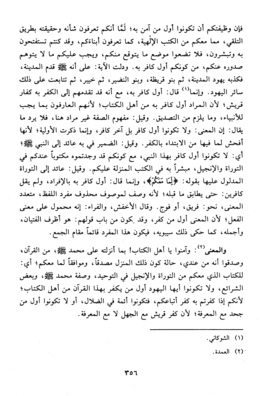 فإن وظيفتكم أن تكونوا أول من آمن به؛ لمّا أنكم تعرفون شأنه وحقيقته بطريق التلقي، مما معكم من الكتب الإلهية، كما تعرفون أبناءكم، وقد كنتم تستفتحون به وتبشرون، فلا تضعوا موضع ما يتوقع منكم، ويجب عليكم ما لا يتوهم صدوره عنكم، من كونكم أول كافر به. ودلت الآية: على أنه صلّى الله عليه وسلّم قدم المدينة، فكذبه يهود المدينة، ثم بنو قريظة، وبنو النضير، ثم خيبر، ثم تتابعت على ذلك سائر اليهود. وإنما (¬1) قال: أول كافر به، مع أنه قد تقدمهم إلى الكفر به كفار قريش؛ لأن المراد أول كافر به من أهل الكتاب؛ لأنهم العارفون بما يجب للأنبياء، وما يلزم من التصديق. وقيل: مفهوم الصفة غير مراد هنا، فلا يرد ما يقال: إن المعنى: ولا تكونوا أول كافر بل آخر كافر، وإنما ذكرت الأولية؛ لأنها أفحش لما فيها من الابتداء بالكفر. وقيل: الضمير في به عائد إلى النبي صلّى الله عليه وسلّم؛ أي: لا تكونوا أول كافر بهذا النبي، مع كونكم قد وجدتموه مكتوبا عندكم في التوراة والإنجيل، مبشرا به في الكتب المنزلة عليكم. وقيل: عائد إلى التوراة المدلول عليها بقوله: {لِما مَعَكُمْ}، وإنما قال: أول كافر به بالإفراد، ولم يقل كافرين: حتى يطابق ما قبله؛ لأنه وصف لموصوف محذوف مفرد اللفظ، متعدد المعنى، نحو: فريق، أو فوج. وقال الأخفش، والفراء: إنه محمول على معنى الفعل؛ لأن المعنى أول من كفر، وقد يكون من باب قولهم: هو أظرف الفتيان، وأجمله، كما حكى ذلك سيبويه، فيكون هذا المفرد قائما مقام الجمع.
