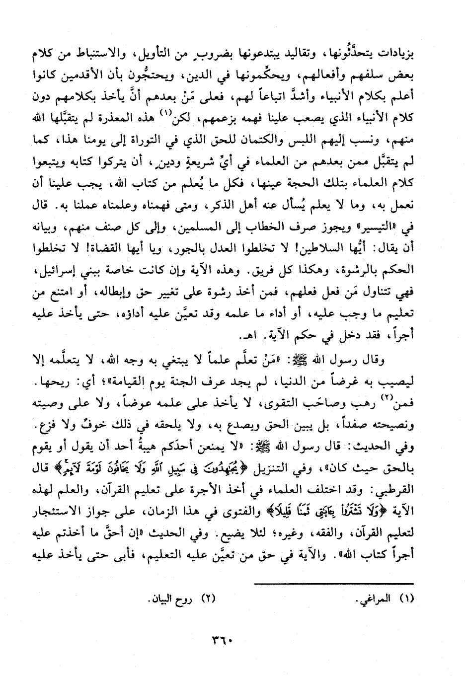 وفي الحديث: قال رسول الله صلّى الله عليه وسلّم: «لا يمنعن أحدكم هيبة أحد أن يقول أو يقوم بالحق حيث كان»، وفي التنزيل {يُجاهِدُونَ فِي سَبِيلِ اللَّهِ وَلا يَخافُونَ لَوْمَةَ لائِمٍ} قال القرطبي: وقد اختلف العلماء في أخذ الأجرة على تعليم القرآن، والعلم لهذه الآية {وَلا تَشْتَرُوا بِآياتِي ثَمَنًا قَلِيلًا} والفتوى في هذا الزمان، على جواز الاستئجار لتعليم القرآن، والفقه، وغيره؛ لئلا يضيع. وفي الحديث «إن أحقّ ما أخذتم عليه أجرا كتاب الله». والآية في حق من تعيّن عليه التعليم، فأبى حتى يأخذ عليه