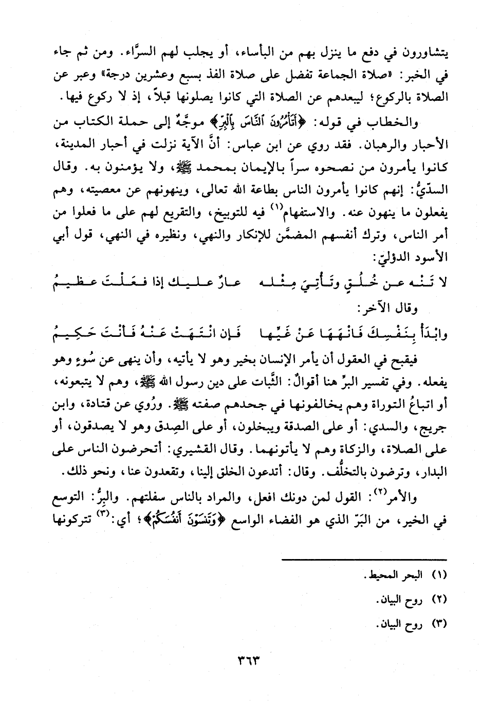 والأمر (¬2): القول لمن دونك افعل، والمراد بالناس سفلتهم. والبرّ: التوسع في الخير، من البرّ الذي هو الفضاء الواسع {وَتَنْسَوْنَ أَنْفُسَكُمْ}؛ أي: (¬3) تتركونها