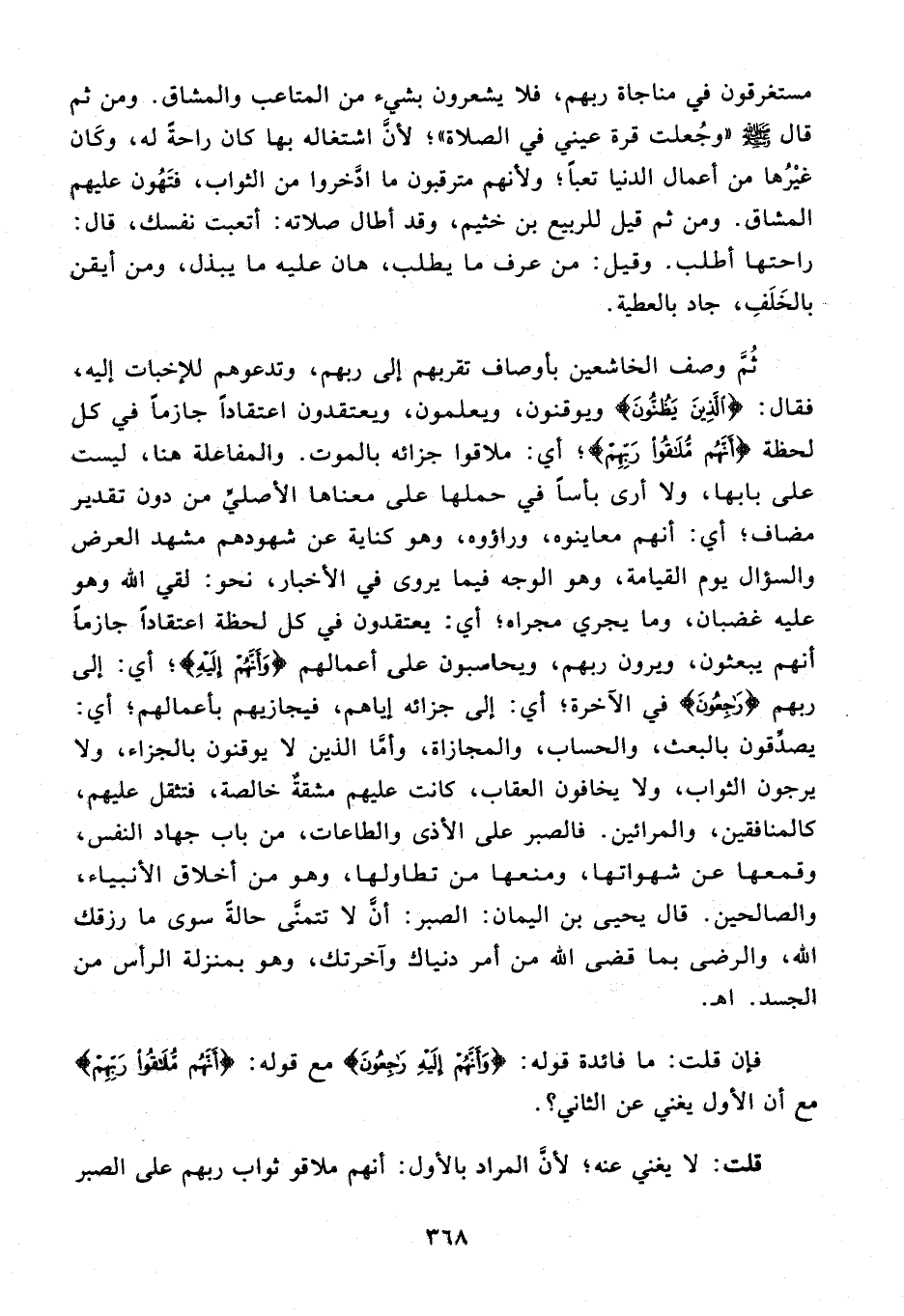 فإن قلت: ما فائدة قوله: {وَأَنَّهُمْ إِلَيْهِ راجِعُونَ} مع قوله: {أَنَّهُمْ مُلاقُوا رَبِّهِمْ} مع أن الأول يغني عن الثاني؟.