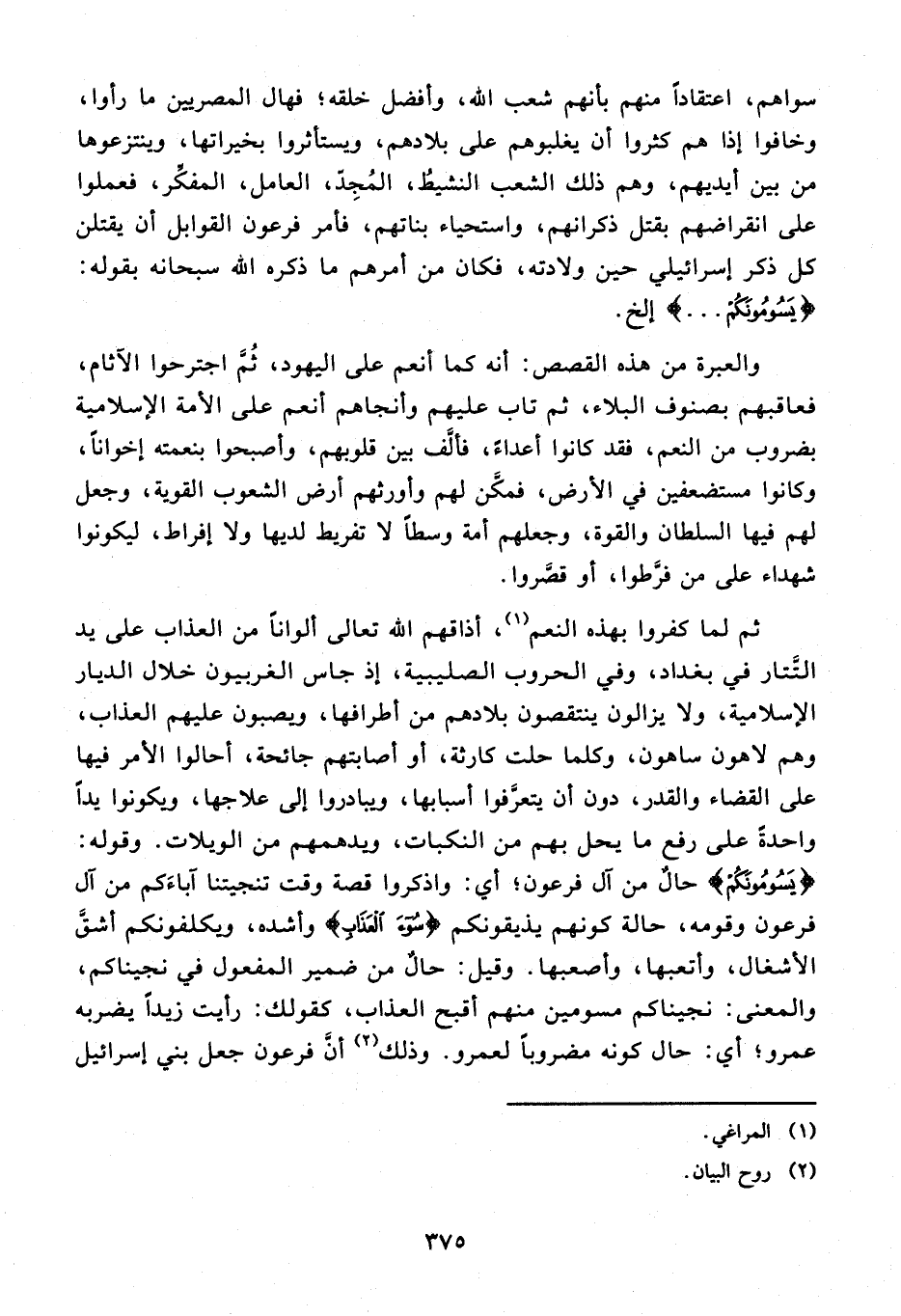 سواهم، اعتقادا منهم بأنهم شعب الله، وأفضل خلقه؛ فهال المصريين ما رأوا، وخافوا إذا هم كثروا أن يغلبوهم على بلادهم، ويستأثروا بخيراتها، وينتزعوها من بين أيديهم، وهم ذلك الشعب النشيط، المجدّ، العامل، المفكّر، فعملوا على انقراضهم بقتل ذكرانهم، واستحياء بناتهم، فأمر فرعون القوابل أن يقتلن كل ذكر إسرائيلي حين ولادته، فكان من أمرهم ما ذكره الله سبحانه بقوله: {يَسُومُونَكُمْ ...} إلخ.