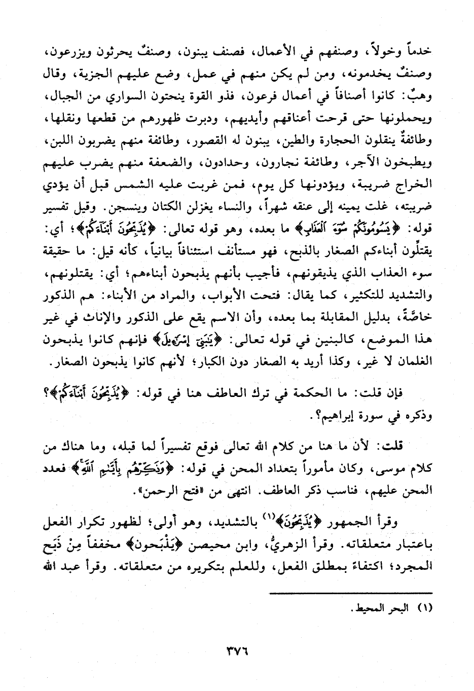 وقرأ الجمهور {يُذَبِّحُونَ} (¬1) بالتشديد، وهو أولى؛ لظهور تكرار الفعل باعتبار متعلقاته. وقرأ الزهريّ، وابن محيصن {يذبحون} مخففا من ذبح المجرد؛ اكتفاء بمطلق الفعل، وللعلم بتكريره من متعلقاته. وقرأ عبد الله