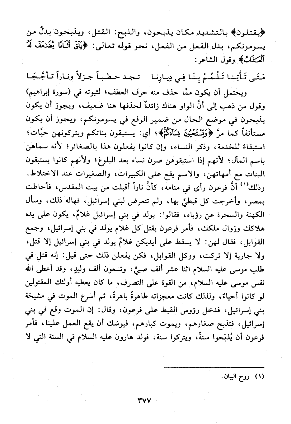 ويحتمل أن يكون ممّا حذف منه حرف العطف؛ لثبوته في (سورة إبراهيم) وقول من ذهب إلى أنّ الواو هناك زائدة لحذفها هنا ضعيف، ويجوز أن يكون يذبحون في موضع الحال من ضمير الرفع في يسومونكم، ويجوز أن يكون مستأنفا كما مرّ {وَيَسْتَحْيُونَ نِساءَكُمْ}؛ أي: يستبقون بناتكم ويتركونهن حيّات؛ استبقاء للخدمة، وذكر النساء، وإن كانوا يفعلون هذا بالصغائر؛ لأنه سماهن باسم المآل؛ لأنهم إذا استبقوهن صرن نساء بعد البلوغ؛ ولأنهم كانوا يستبقون البنات مع أمهاتهن، والاسم يقع على الكبيرات، والصغيرات عند الاختلاط.