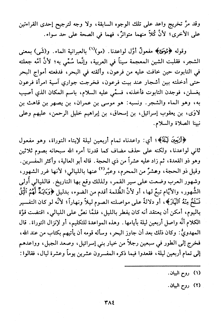 وقوله {مُوسى} مفعول أوّل لواعدنا. (مو) (¬1) بالعبرانية الماء. و (شى) بمعنى الشجر، فقلبت الشين المعجمة سينا في العربية، وإنّما سمّي به؛ لأنّ أمّه جعلته في التابوت حين خافت عليه من فرعون، وألقته في البحر، فدفعته أمواج البحر حتى أدخلته بين أشجار عند بيت فرعون، فخرجت جواري آسية امرأة فرعون يغسلن، فوجدن التابوت فأخذنه، فسمّي عليه السلام، باسم المكان الذي أصيب به، وهو الماء والشجر. ونسبه: هو موسى بن عمران، بن يصهر بن قاهث بن لاوى، بن يعقوب إسرائيل، بن إسحاق، بن إبراهيم خليل الرحمن، عليهم وعلى نبينا الصلاة والسلام.