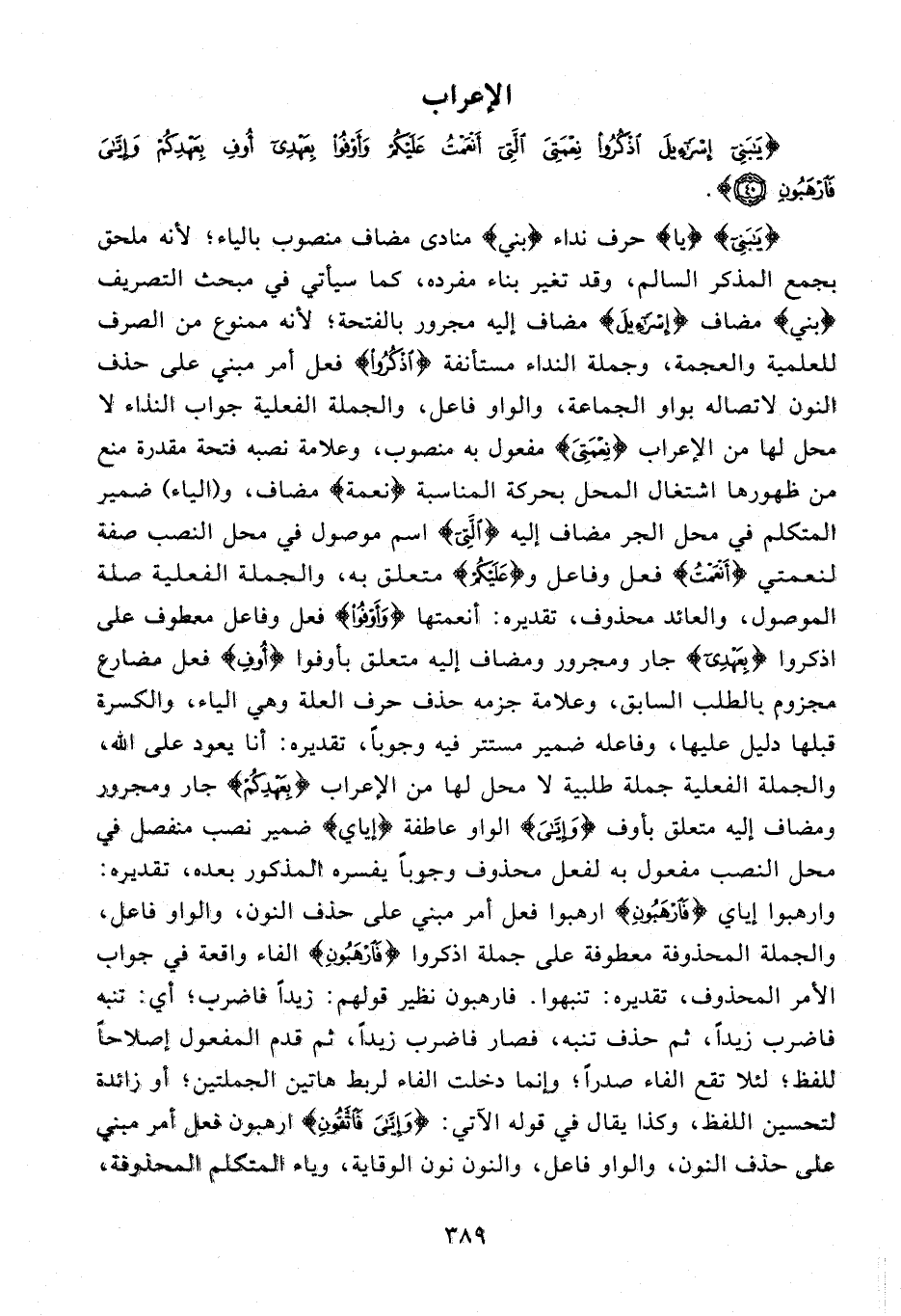 {يا بَنِي} {يا} حرف نداء {بَنِي} منادى مضاف منصوب بالياء؛ لأنه ملحق بجمع المذكر السالم، وقد تغير بناء مفرده، كما سيأتي في مبحث التصريف {بَنِي} مضاف {إِسْرائِيلَ} مضاف إليه مجرور بالفتحة؛ لأنه ممنوع من الصرف للعلمية والعجمة، وجملة النداء مستأنفة {اذْكُرُوا} فعل أمر مبني على حذف النون لاتصاله بواو الجماعة، والواو فاعل، والجملة الفعلية جواب النداء لا محل لها من الإعراب {نِعْمَتِيَ} مفعول به منصوب، وعلامة نصبه فتحة مقدرة منع من ظهورها اشتغال المحل بحركة المناسبة {نعمة} مضاف، و (الياء) ضمير المتكلم في محل الجر مضاف إليه {الَّتِي} اسم موصول في محل النصب صفة لنعمتي {أَنْعَمْتُ} فعل وفاعل و {عَلَيْكُمْ} متعلق به، والجملة الفعلية صلة الموصول، والعائد محذوف، تقديره: أنعمتها {وَأَوْفُوا} فعل وفاعل معطوف على اذكروا {بِعَهْدِي} جار ومجرور ومضاف إليه متعلق بأوفوا {أُوفِ} فعل مضارع مجزوم بالطلب السابق، وعلامة جزمه حذف حرف العلة وهي الياء، والكسرة قبلها دليل عليها، وفاعله ضمير مستتر فيه وجوبا، تقديره: أنا يعود على الله، والجملة الفعلية جملة طلبية لا محل لها من الإعراب {بِعَهْدِكُمْ} جار ومجرور ومضاف إليه متعلق بأوف {وَإِيَّايَ} الواو عاطفة {إِيَّايَ} ضمير نصب منفصل في محل النصب مفعول به لفعل محذوف وجوبا يفسره المذكور بعده، تقديره: