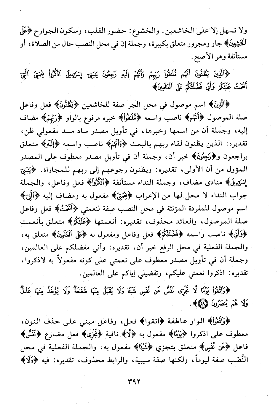 {الَّذِينَ} اسم موصول في محل الجر صفة للخاشعين {يَظُنُّونَ} فعل وفاعل صلة الموصول {أَنَّهُمْ} ناصب واسمه {مُلاقُوا} خبره مرفوع بالواو {رَبِّهِمْ} مضاف إليه، وجملة أن من اسمها وخبرها، في تأويل مصدر ساد مسد مفعولي ظن، تقديره: الذين يظنون لقاء ربهم بالبعث {وَأَنَّهُمْ} ناصب واسمه {إِلَيْهِ} متعلق براجعون و {راجِعُونَ} خبر أن، وجملة أن في تأويل مصدر معطوف على المصدر المؤول من أن الأولى، تقديره: ويظنون رجوعهم إلى ربهم للمجازاة. {يا بَنِي إِسْرائِيلَ} منادى مضاف، وجملة النداء مستأنفة {اذْكُرُوا} فعل وفاعل، والجملة جواب النداء لا محل لها من الإعراب {نِعْمَتِيَ} مفعول به ومضاف إليه {الَّتِي} اسم موصول للمفردة المؤنثة في محل النصب صفة لنعمتي {أَنْعَمْتُ} فعل وفاعل صلة الموصول، والعائد محذوف، تقديره: أنعمتها {عَلَيْكُمْ} متعلق بأنعمت {وَأَنِّي} ناصب واسمه {فَضَّلْتُكُمْ} فعل وفاعل ومفعول به {عَلَى الْعالَمِينَ} متعلق به، والجملة الفعلية في محل الرفع خبر أن، تقديره: وأني مفضلكم على العالمين، وجملة أن في تأويل مصدر معطوف على نعمتي على كونه مفعولا به لاذكروا، تقديره: اذكروا نعمتي عليكم، وتفضيلي إياكم على العالمين.