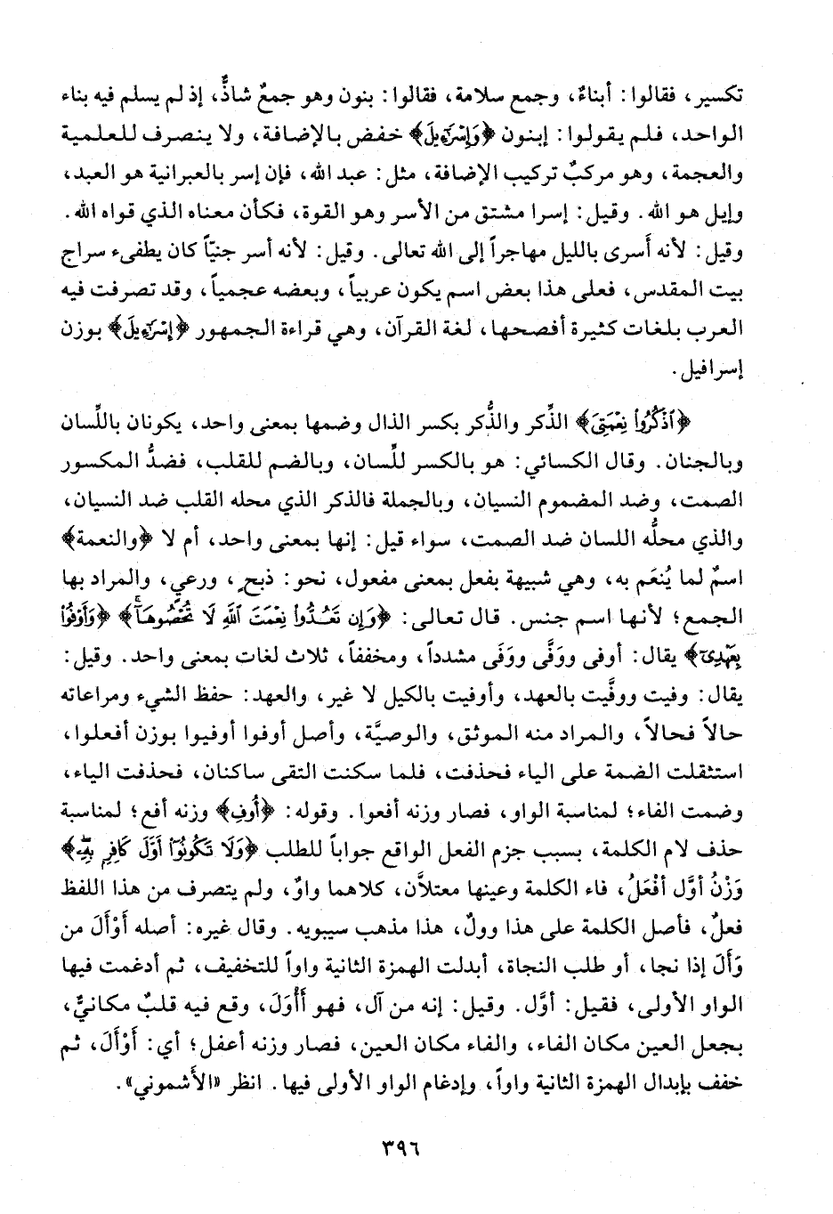 {اذْكُرُوا نِعْمَتِيَ} الذّكر والذّكر بكسر الذال وضمها بمعنى واحد، يكونان باللّسان وبالجنان. وقال الكسائي: هو بالكسر للّسان، وبالضم للقلب، فضدّ المكسور الصمت، وضد المضموم النسيان، وبالجملة فالذكر الذي محله القلب ضد النسيان، والذي محلّه اللسان ضد الصمت، سواء قيل: إنها بمعنى واحد، أم لا (والنعمة) اسم لما ينعم به، وهي شبيهة بفعل بمعنى مفعول، نحو: ذبح، ورعي، والمراد بها الجمع؛ لأنها اسم جنس. قال تعالى: {وَإِنْ تَعُدُّوا نِعْمَتَ اللَّهِ لا تُحْصُوها} {وَأَوْفُوا بِعَهْدِي} يقال: أوفى ووفّى ووفى مشددا، ومخففا، ثلاث لغات بمعنى واحد. وقيل: يقال: وفيت ووفّيت بالعهد، وأوفيت بالكيل لا غير، والعهد: حفظ الشيء ومراعاته حالا فحالا، والمراد منه الموثق، والوصيّة، وأصل أوفوا أوفيوا بوزن أفعلوا، استثقلت الضمة على الياء فحذفت، فلما سكنت التقى ساكنان، فحذفت الياء، وضمت الفاء؛ لمناسبة الواو، فصار وزنه أفعوا. وقوله: {أُوفِ} وزنه أفع؛ لمناسبة حذف لام الكلمة، بسبب جزم الفعل الواقع جوابا للطلب {وَلا تَكُونُوا أَوَّلَ كافِرٍ بِهِ} وزن أوّل أفعل، فاء الكلمة وعينها معتلّان، كلاهما واو، ولم يتصرف من هذا اللفظ فعل، فأصل الكلمة على هذا وول، هذا مذهب سيبويه. وقال غيره: أصله أو أل من وأل إذا نجا، أو طلب النجاة، أبدلت الهمزة الثانية واوا للتخفيف، ثم أدغمت فيها الواو الأولى، فقيل: أوّل. وقيل: إنه من آل، فهو أأول، وقع فيه قلب مكانيّ، بجعل العين مكان الفاء، والفاء مكان العين، فصار وزنه أعفل؛ أي: أو أل، ثم خفف بإبدال الهمزة الثانية واوا، وإدغام الواو الأولى فيها. انظر «الأشموني».