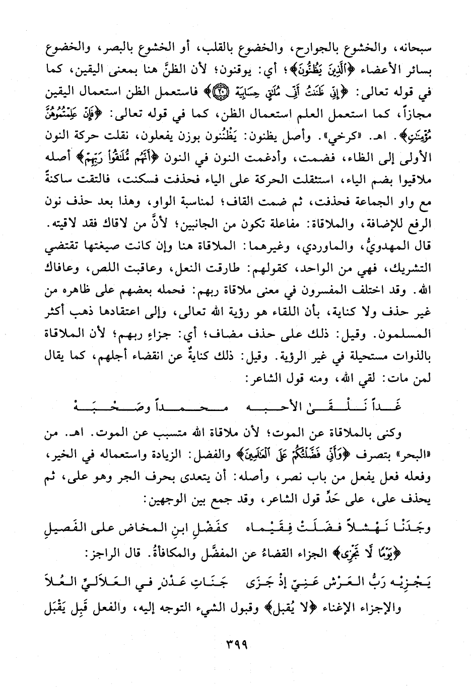 سبحانه، والخشوع بالجوارح، والخضوع بالقلب، أو الخشوع بالبصر، والخضوع بسائر الأعضاء {الَّذِينَ يَظُنُّونَ}؛ أي: يوقنون؛ لأن الظنّ هنا بمعنى اليقين، كما في قوله تعالى: {إِنِّي ظَنَنْتُ أَنِّي مُلاقٍ حِسابِيَهْ (20)} فاستعمل الظن استعمال اليقين مجازا، كما استعمل العلم استعمال الظن، كما في قوله تعالى: {فَإِنْ عَلِمْتُمُوهُنَّ مُؤْمِناتٍ}. اه. «كرخي». وأصل يظنون: يظننون بوزن يفعلون، نقلت حركة النون الأولى إلى الظاء، فضمت، وأدغمت النون في النون {أَنَّهُمْ مُلاقُوا رَبِّهِمْ} أصله ملاقيوا بضم الياء، استثقلت الحركة على الياء فحذفت فسكنت، فالتقت ساكنة مع واو الجماعة فحذفت، ثم ضمت القاف؛ لمناسبة الواو، وهذا بعد حذف نون الرفع للإضافة، والملاقاة: مفاعلة تكون من الجانبين؛ لأنّ من لاقاك فقد لاقيته.