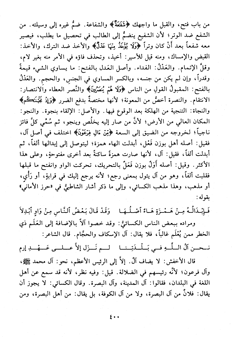 من باب فتح، والقبل ما واجهك {شَفاعَةٌ} والشفاعة. ضمّ غيره إلى وسيلته. من الشفع ضد الوتر؛ لأن الشفيع ينضمّ إلى الطالب في تحصيل ما يطلب، فيصير معه شفعا بعد أن كان وترا {وَلا يُؤْخَذُ مِنْها عَدْلٌ} والأخذ ضد الترك، والأخذ: القبض والإمساك، ومنه قيل للأسير: أخيذ، وتحذف فاؤه في الأمر منه بغير لام، وقلّ الإتمام. والعدل: الفداء. وأصل العدل بالفتح: ما يساوي الشيء قيمة وقدرا، وإن لم يكن من جنسه، وبالكسر المساوي في الجنس، والحجم. والعدل بالفتح: المقبول القول من الناس {وَلا هُمْ يُنْصَرُونَ} والنّصر العطاء والانتصار: الانتقام. والنصرة أخصّ من المعونة؛ لأنها مختصة بدفع الضرر {وَإِذْ نَجَّيْناكُمْ} والنجاة: التنجية من الهلكة بعد الوقوع فيها. والأصل: الإلقاء بنجوة. والنجو: المكان العالي من الأرض؛ لأنّ من صار إليه يخلص وينجو، ثم سمّي كلّ فائز ناجيا؛ لخروجه من الضيق إلى السعة {مِنْ آلِ فِرْعَوْنَ} اختلف في أصل آل، فقيل: أصله أهل بوزن فعل، أبدلت الهاء همزة؛ ليتوصل إلى إبدالها ألفا، ثم أبدلت ألفا، فقيل: آل، لأنها صارت همزة ساكنة بعد أخرى مفتوحة، وعلى هذا الأكثر. وقيل: أصله أول بوزن فعل بالتحريك، تحركت الواو وانفتح ما قبلها فقلبت ألفا، وهو من آل يئول بمعنى رجع؛ لأنه يرجع إليك في قرابة، أو رأي، أو مذهب، وهذا مذهب الكسائي، وإلى ما ذكر أشار الشاطبيّ في «حرز الأماني» بقوله: