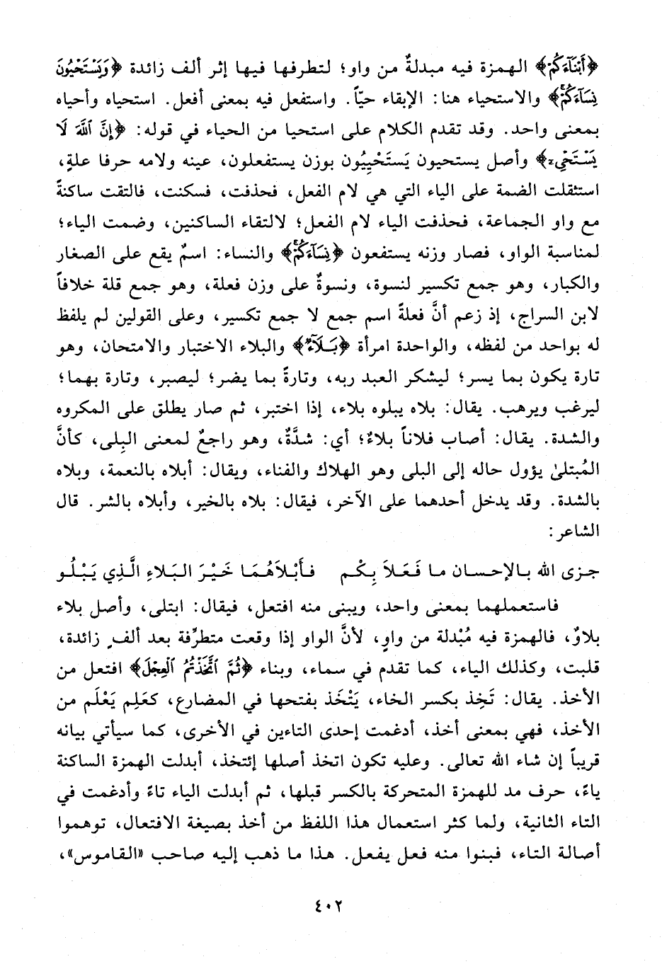 {أَبْناءَكُمْ} الهمزة فيه مبدلة من واو؛ لتطرفها فيها إثر ألف زائدة {وَيَسْتَحْيُونَ نِساءَكُمْ} والاستحياء هنا: الإبقاء حيّا. واستفعل فيه بمعنى أفعل. استحياه وأحياه بمعنى واحد. وقد تقدم الكلام على استحيا من الحياء في قوله: {إِنَّ اللَّهَ لا يَسْتَحْيِي} وأصل يستحيون يستحييون بوزن يستفعلون، عينه ولامه حرفا علة، استثقلت الضمة على الياء التي هي لام الفعل، فحذفت، فسكنت، فالتقت ساكنة مع واو الجماعة، فحذفت الياء لام الفعل؛ لالتقاء الساكنين، وضمت الياء؛ لمناسبة الواو، فصار وزنه يستفعون {نِساءَكُمْ} والنساء: اسم يقع على الصغار والكبار، وهو جمع تكسير لنسوة، ونسوة على وزن فعلة، وهو جمع قلة خلافا لابن السراج، إذا زعم أنّ فعلة اسم جمع لا جمع تكسير، وعلى القولين لم يلفظ له بواحد من لفظه، والواحدة امرأة {بَلاءٌ} والبلاء الاختبار والامتحان، وهو تارة يكون بما يسر؛ ليشكر العبد ربه، وتارة بما يضر؛ ليصبر، وتارة بهما؛ ليرغب ويرهب. يقال: بلاه يبلوه بلاء، إذا اختبر، ثم صار يطلق على المكروه والشدة. يقال: أصاب فلانا بلاء؛ أي: شدّة، وهو راجع لمعنى البلى، كأنّ المبتلى يؤول حاله إلى البلى وهو الهلاك والفناء، ويقال: أبلاه بالنعمة، وبلاه بالشدة. وقد يدخل أحدهما على الآخر، فيقال: بلاه بالخير، وأبلاه بالشر. قال الشاعر: