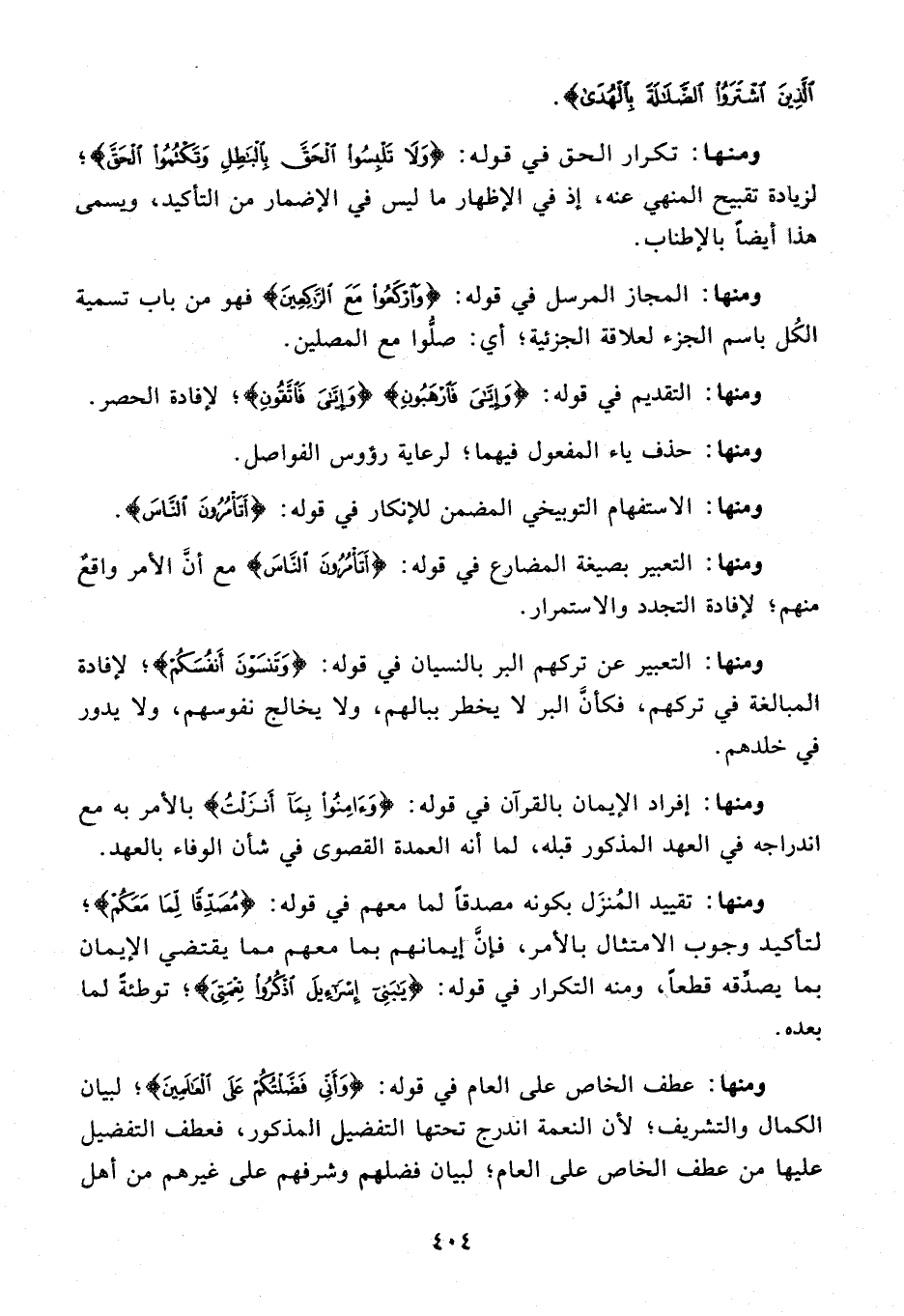 ومنها: تقييد المنزل بكونه مصدقا لما معهم في قوله: {مُصَدِّقًا لِما مَعَكُمْ}؛ لتأكيد وجوب الامتثال بالأمر، فإنّ إيمانهم بما معهم مما يقتضي الإيمان بما يصدّقه قطعا، ومنه التكرار في قوله: {يا بَنِي إِسْرائِيلَ اذْكُرُوا نِعْمَتِيَ}؛ توطئة لما بعده.