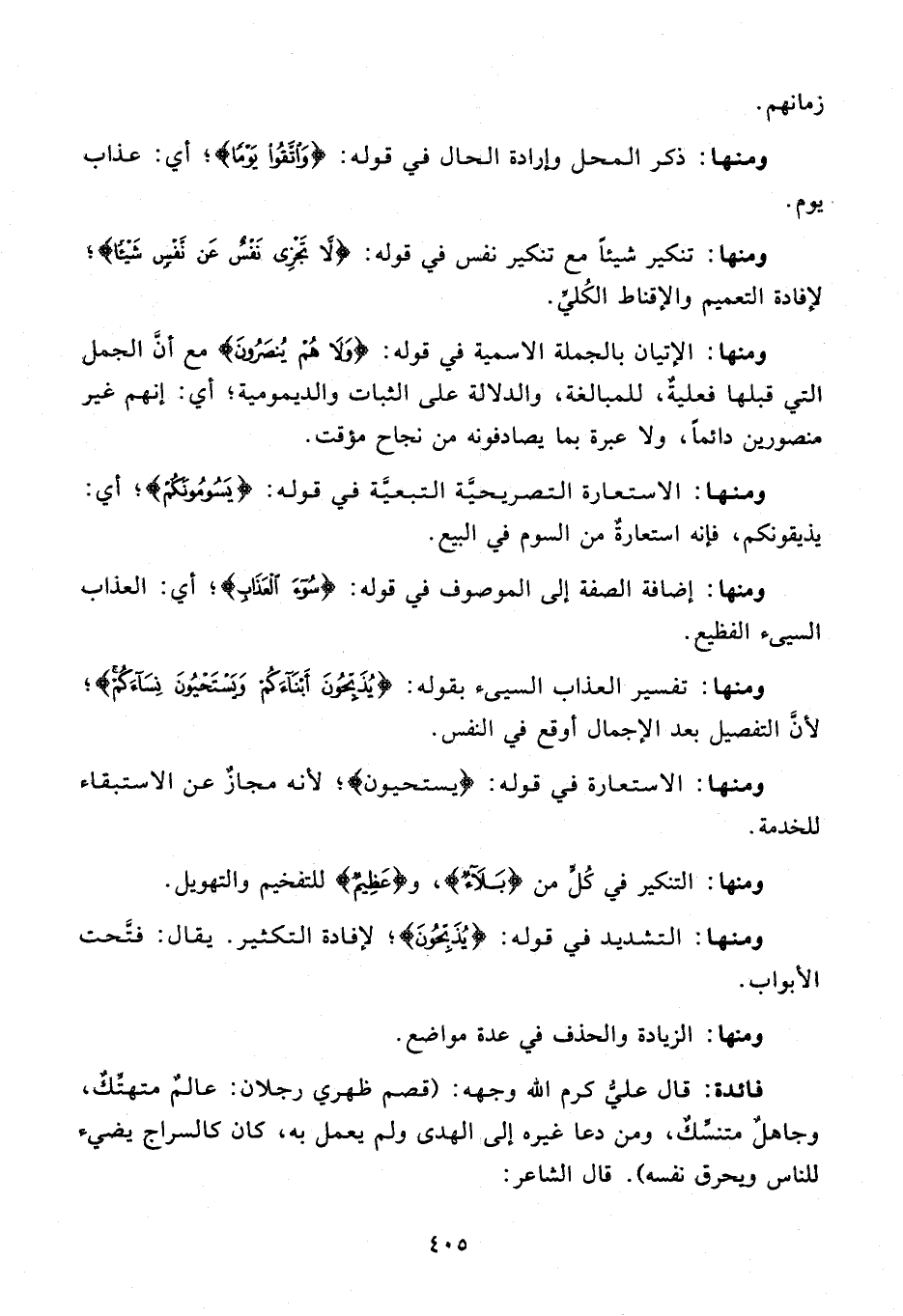 فائدة: قال عليّ كرم الله وجهه: (قصم ظهري رجلان: عالم متهتّك، وجاهل متنسّك، ومن دعا غيره إلى الهدى ولم يعمل به، كان كالسراج يضيء للناس ويحرق نفسه). قال الشاعر: